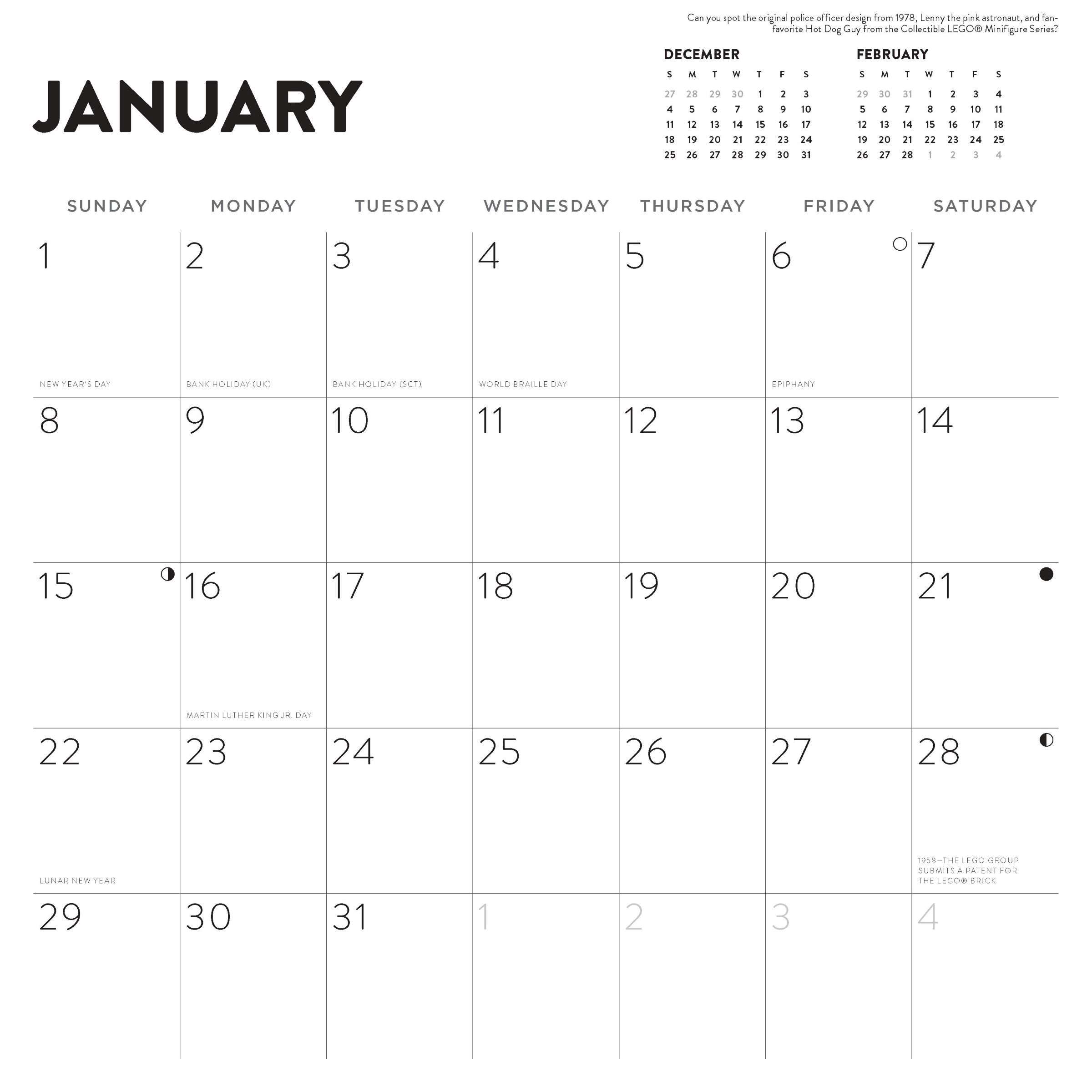 The 2023 LEGO® Wall Calendar provides a joyful monthly dose of LEGO inspiration throughout the year. Each month celebrates the brilliance of LEGO bricks and minifigures with cool artwork and bold designs from the past and present. It’s easy to display the colorful calendar by hanging it on the wall of your home or office. You can also enjoy your calendar before 2023 begins, since it comes with an at-a-glance section for September-December 2022.