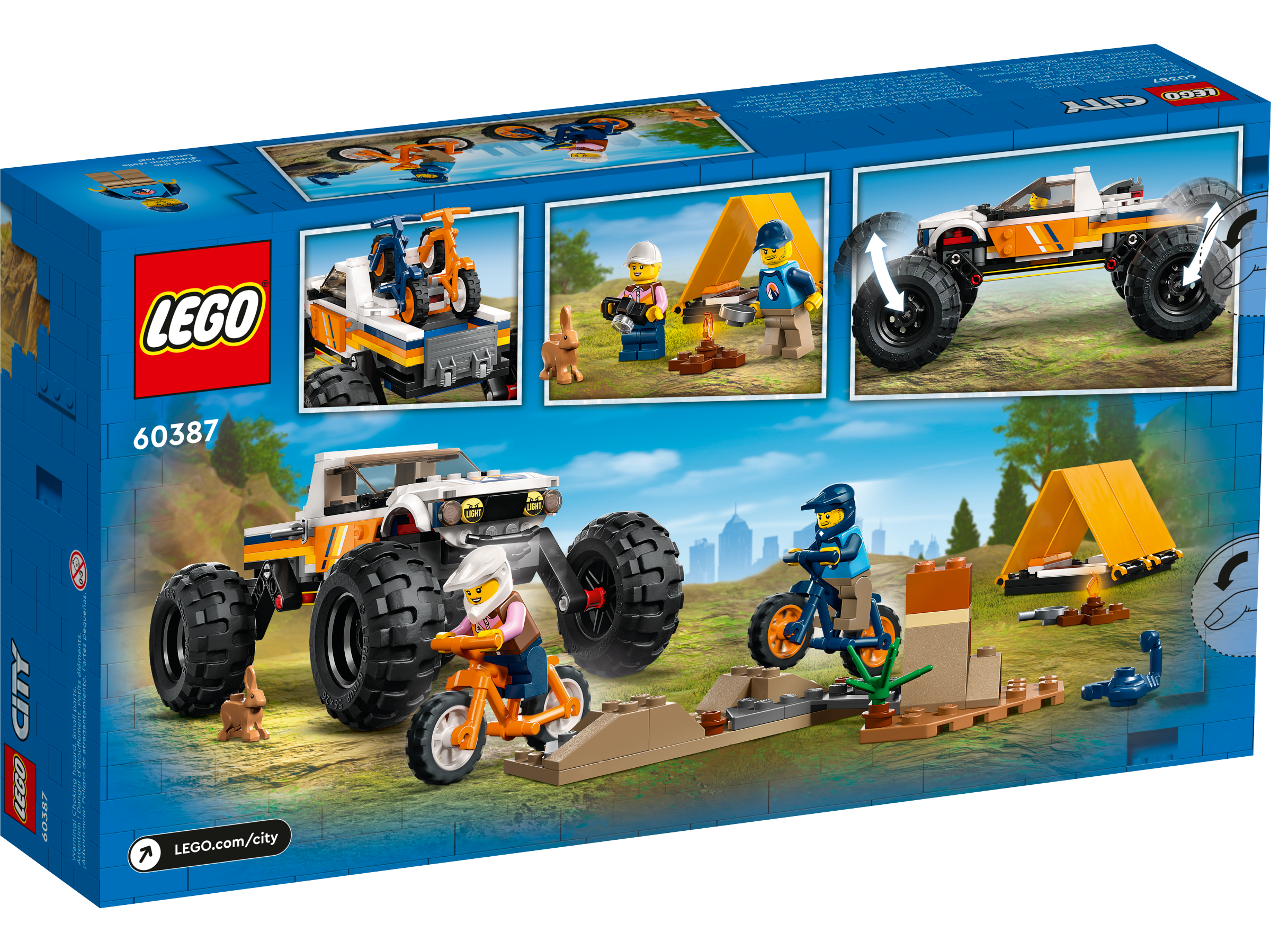 Kids can head out on camping vacations every day with this LEGO® City 4×4 Off-Roader Adventures (60387) playset. The 4×4 vehicle features huge tires and high suspension for a cool off-roader look. Kids also get 2 toy mountain bikes, a LEGO tent and cool accessories including a campfire. Just add the 2 minifigures and animal figure and let the adventures begin!