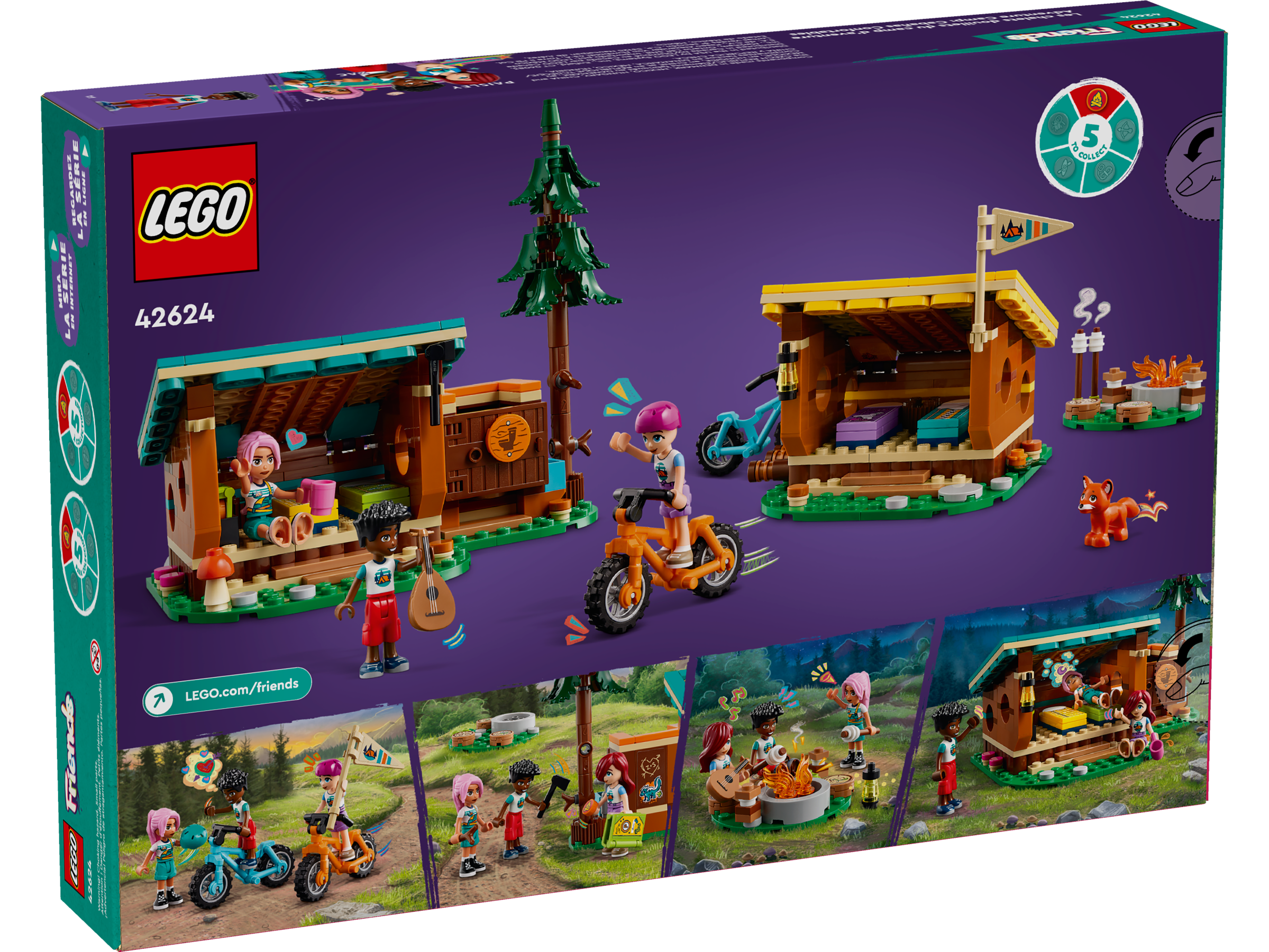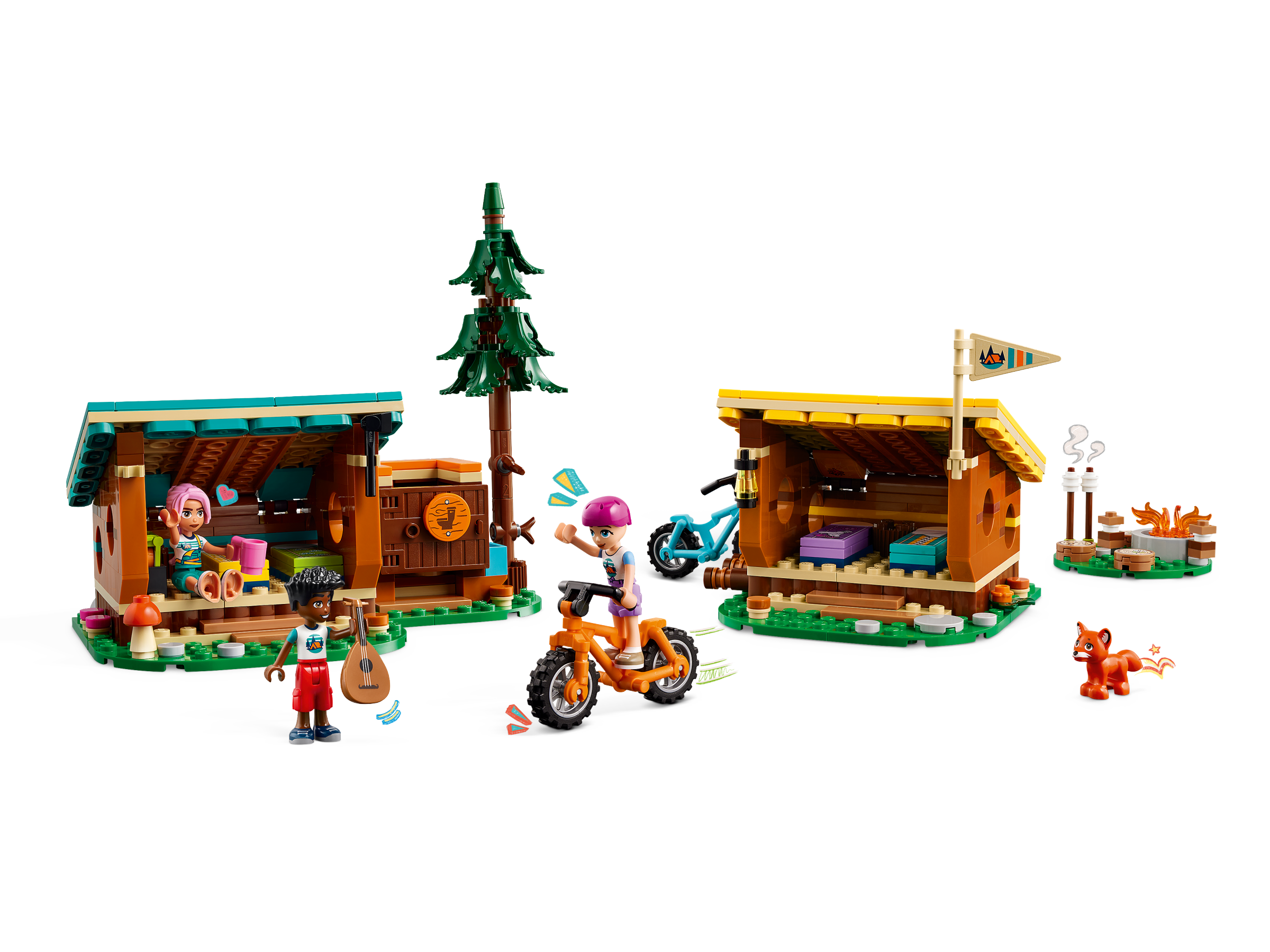 The LEGO® Friends Adventure Camp Cozy Cabins (42624) playset for kids aged 7 comes with 3 mini-dolls, a fox and lots of camping toy accessories so girls and boys can enjoy fun adventures.