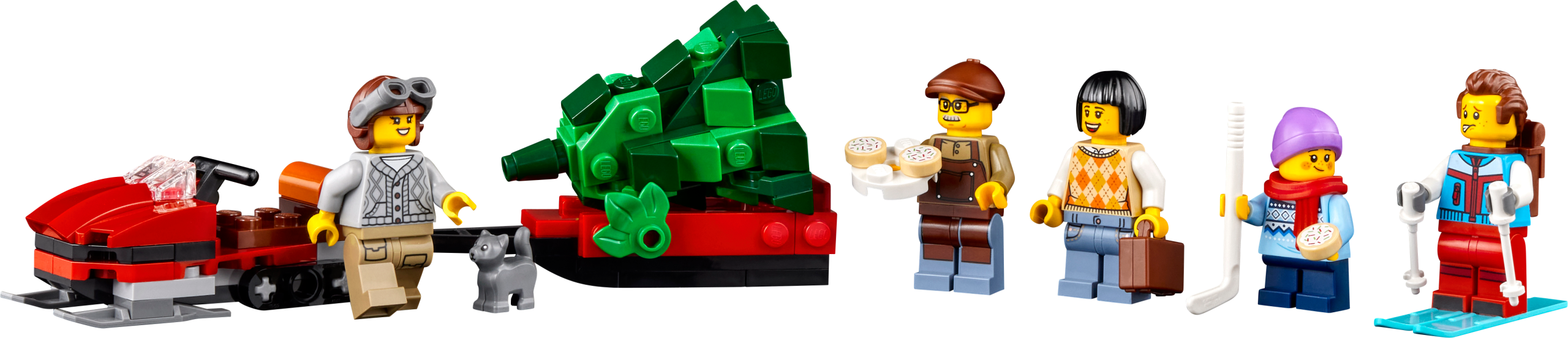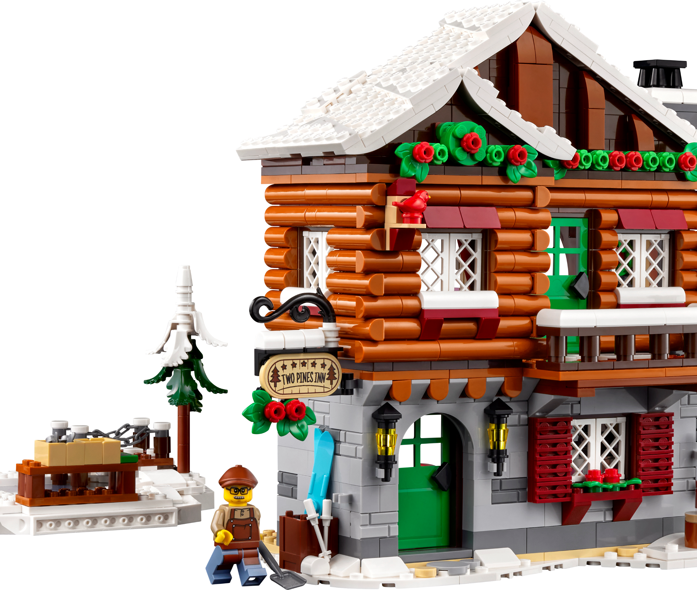 The 3-level model lodge has a furnished reception room with a check-in desk, illuminating log fire and coffee machine, a second-floor guest room with an illuminating log fire and 2 beds, and a third-floor loft bedroom. Outdoor features include a wood store, ski box, skating area and a toilet cabin, plus a snowmobile, Christmas tree, 5 minifigures and bird, cat and squirrel figures.