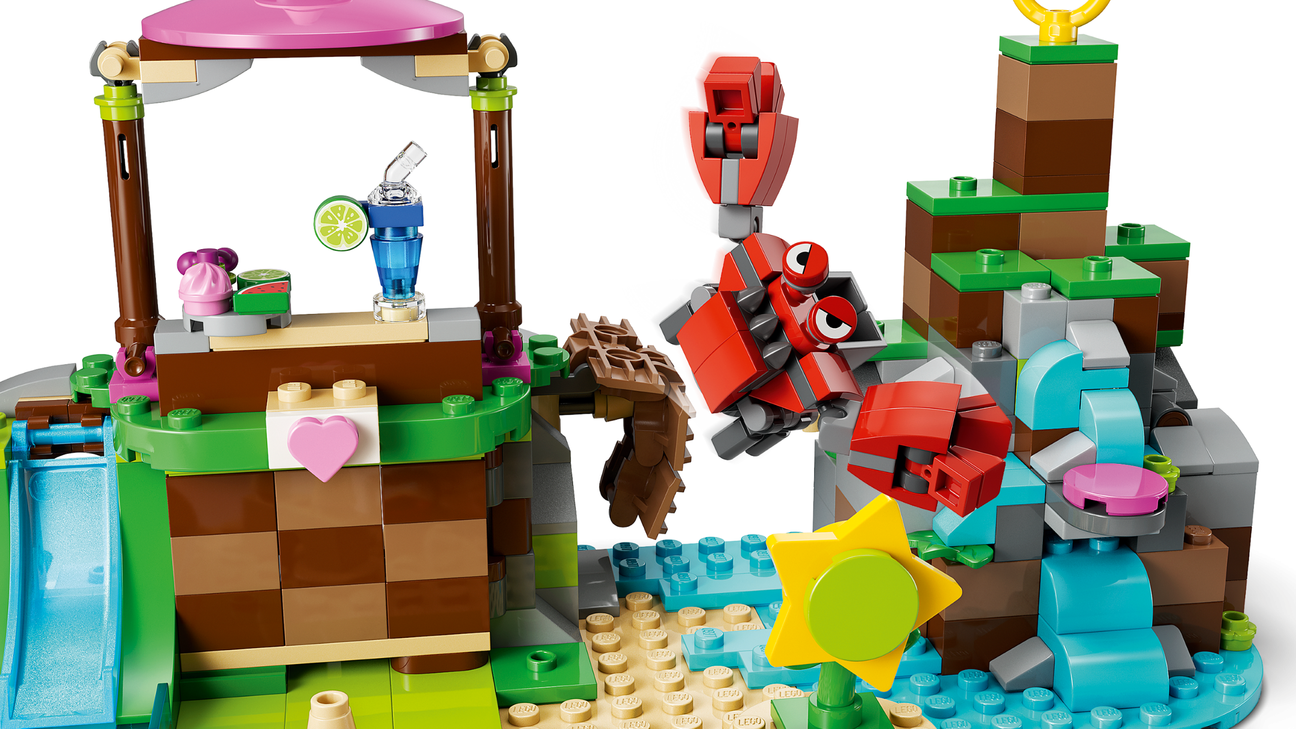 Kids can use the drawbridge and waterfall trap to defeat the Badnik who’s trying to steal the animals. There’s also a secret doorway that leads to the kitchen and sleeping areas where kids can care for the animals that have been saved.