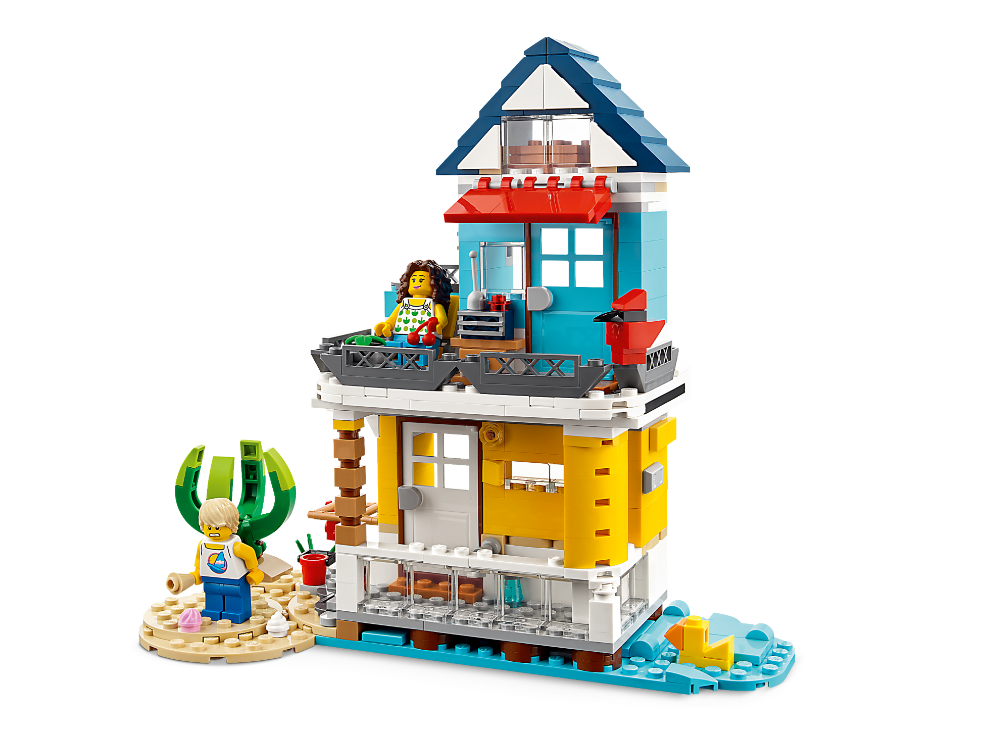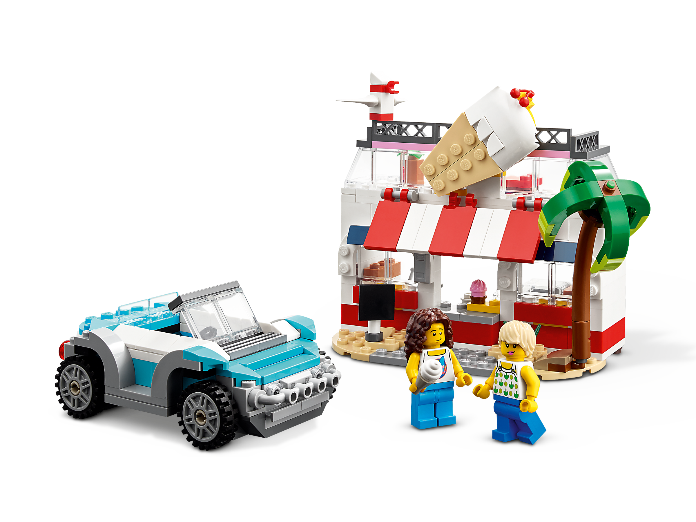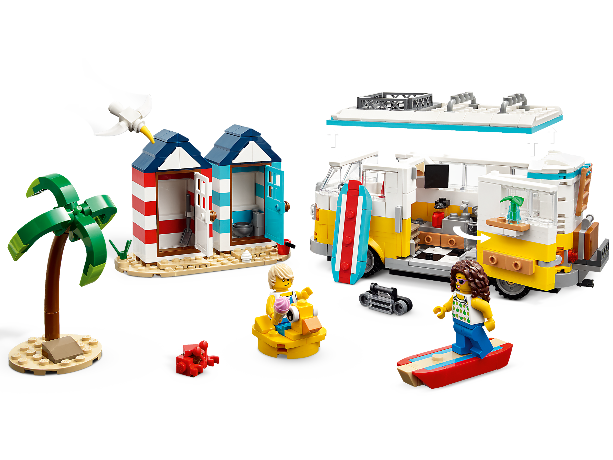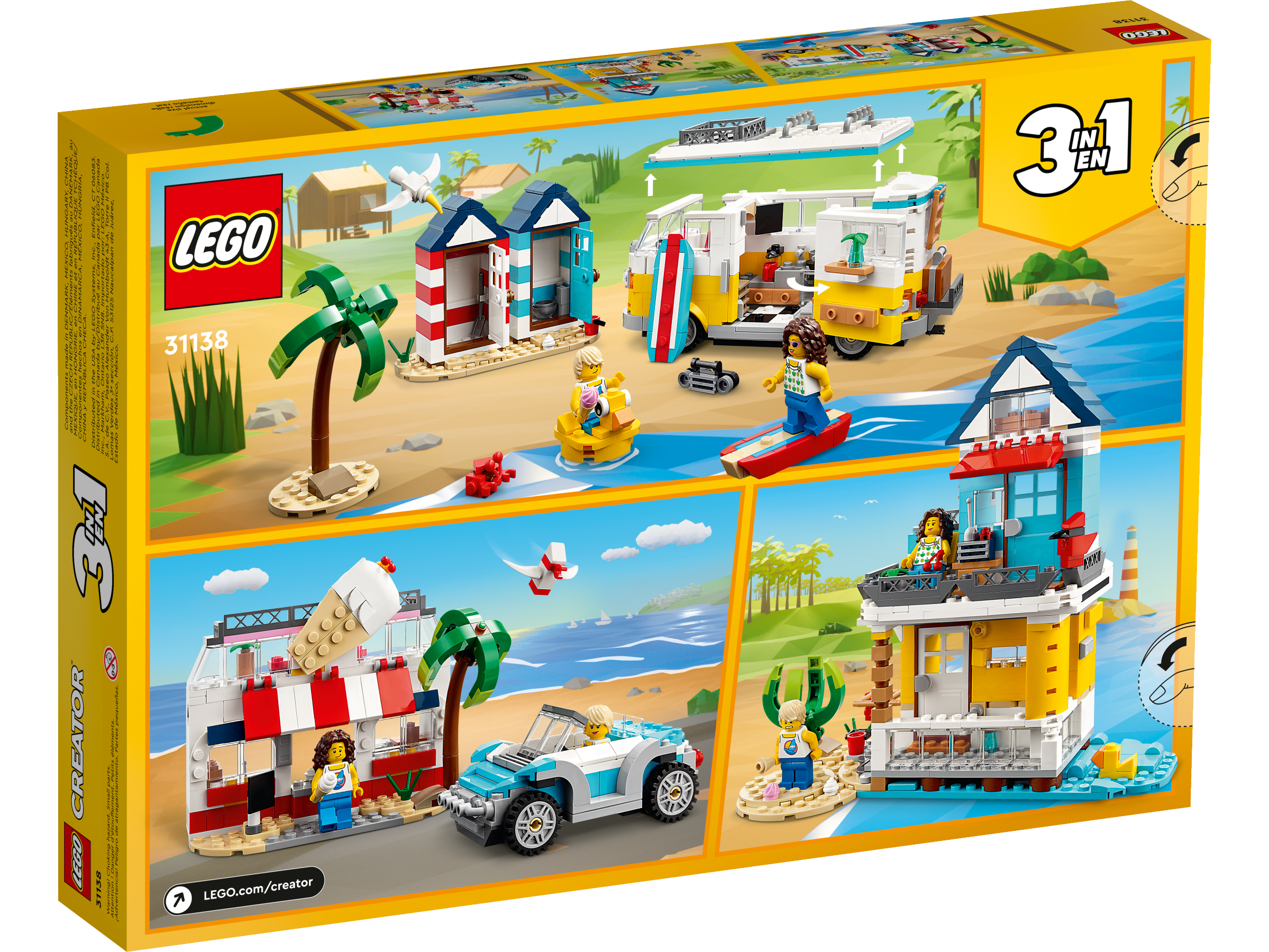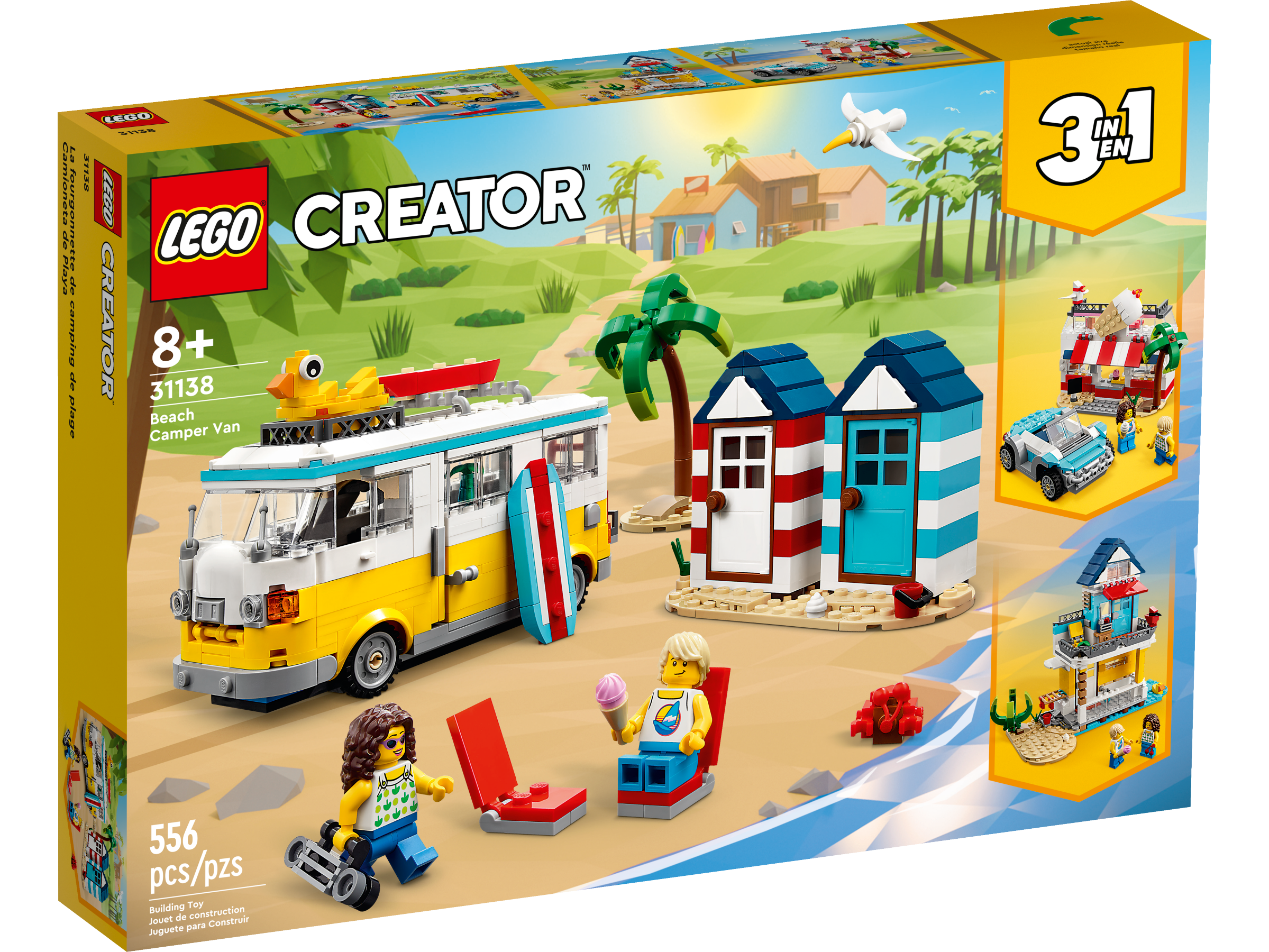 LEGO fans can choose from 3 different buildable beach scenes with this LEGO 3in1 set. They can build a highly detailed Beach Camper Van with 2 beach huts and a palm tree, rebuild it into a 2-floor summerhouse next to a water and sand scene, or rebuild it into an ice-cream shop with a serving window, second-floor terrace with tables and a supercool beach buggy.
