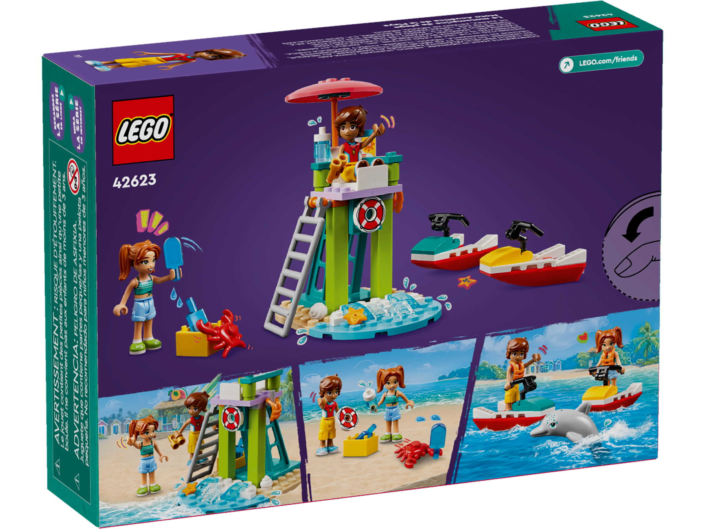 Let kids create fun ocean adventures with this LEGO® Friends Beach Water Scooter (42623) lifeguard toy for kids aged 5 . The set includes 2 mini-dolls, a dolphin figure and accessories to inspire imaginative play.