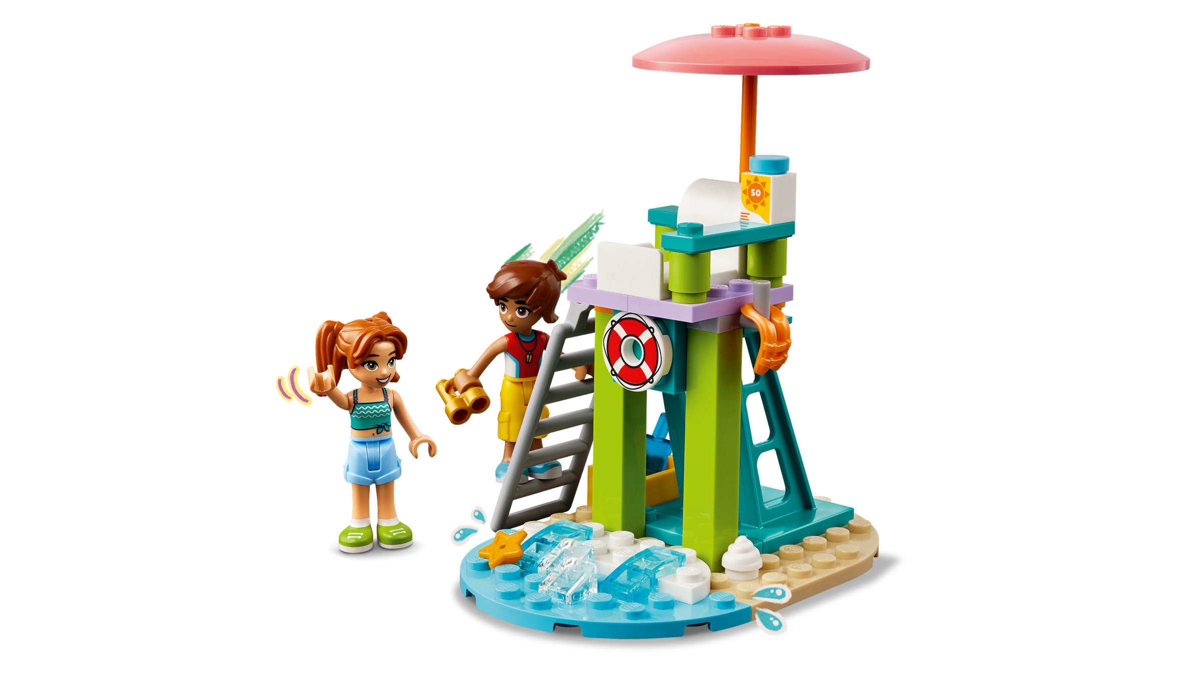 This lifeguard LEGO set comes with 2 water scooter toy accessories so kids can role-play the story. Leo is on lifeguard duty and uses the binoculars to keep watch over the ocean. It’s the perfect viewpoint for spotting dolphins too. Later he joins his friend Candi and the friends race on their water scooters. Kids will love the little details, like the cheeky crab who likes to raid the cooler for ice pops!