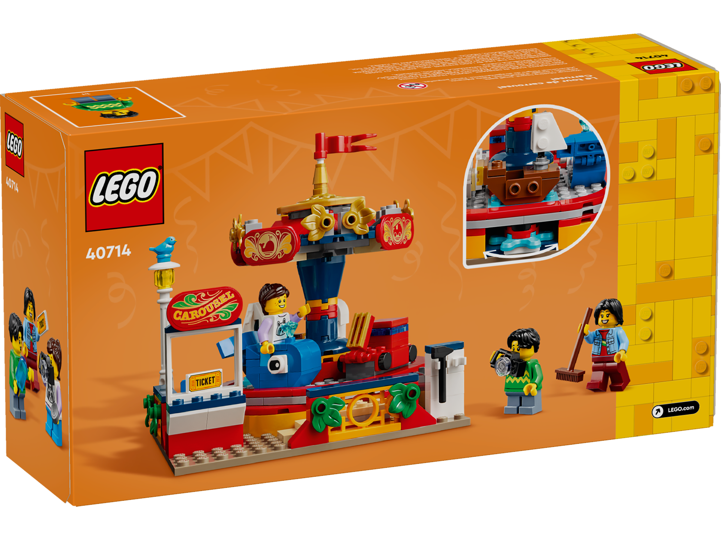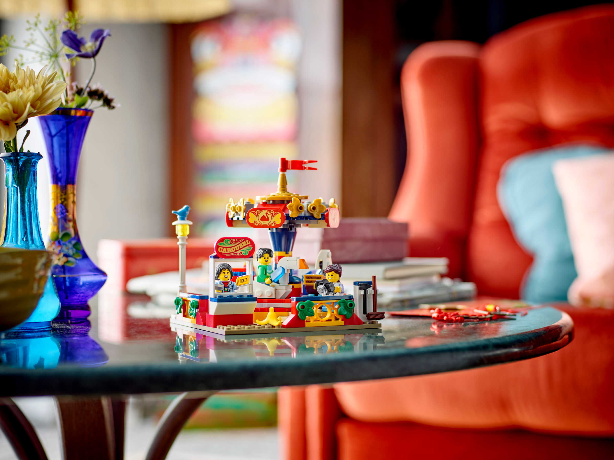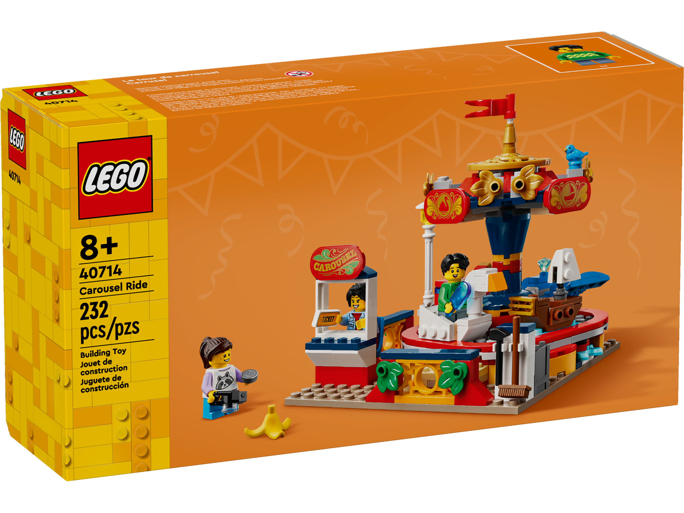 Kids aged 8 can play out fun action with the detailed LEGO® Carousel Ride building set. Decorated in vibrant colors, this amusement park toy features 4 carts, consisting of a swan, a whale, a fire truck and a boat, which can be rotated by turninga pedal gear in its base. There are also 3 minifigures, including a ticket seller, plus a boy with an ice cream and a girl with a camera who can ride in the carts.