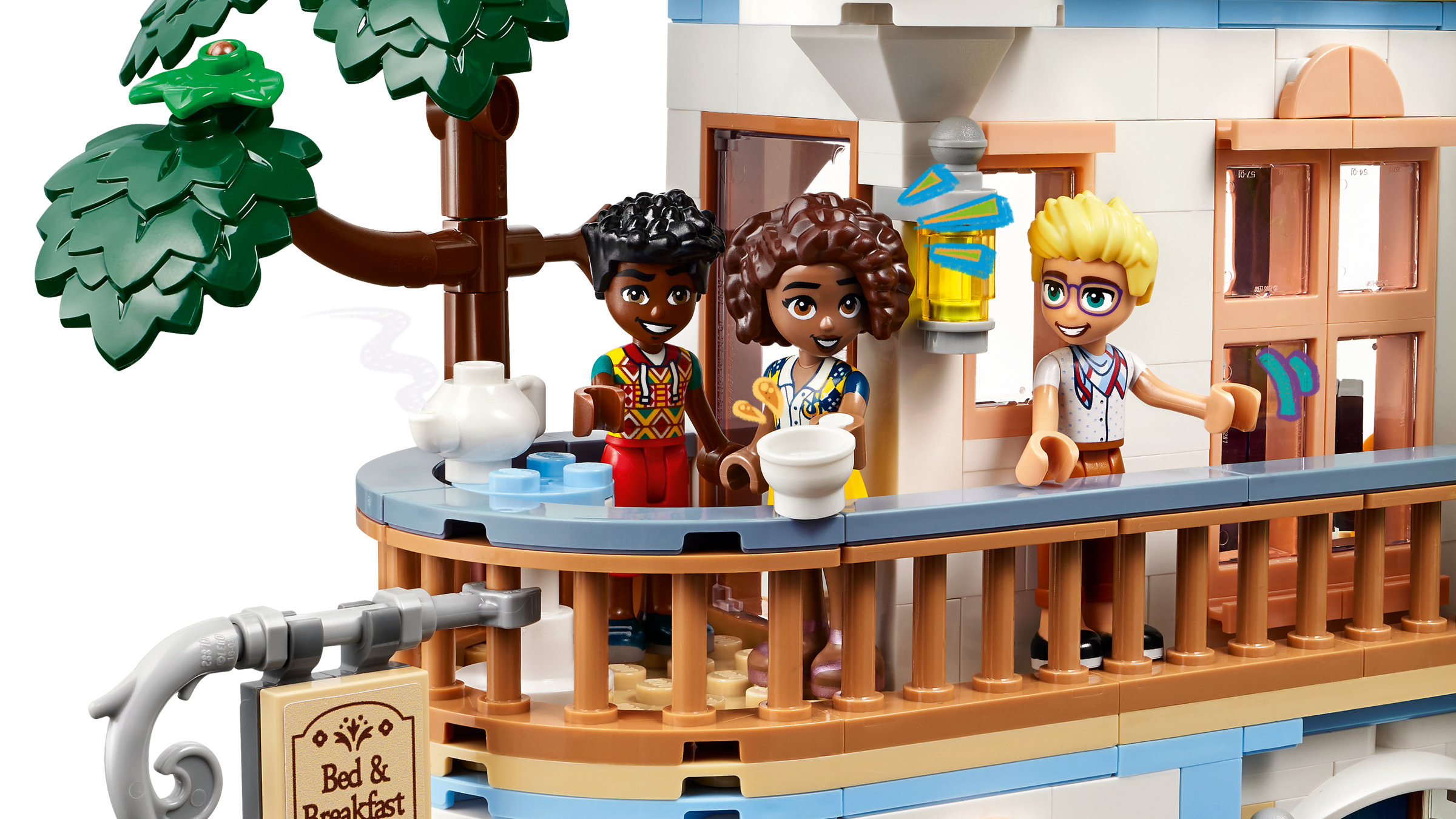 The set tells the story of Renée, who has renovated the historic château, transforming it into a welcoming hotel. On the first floor there’s the front desk and a sunroom. There’s a bedroom on the second floor along with a cozy living room and balcony. Find the master suite and the bathroom with claw-foot bathtub on the third floor, then explore the mysterious attic with its historic artifacts.