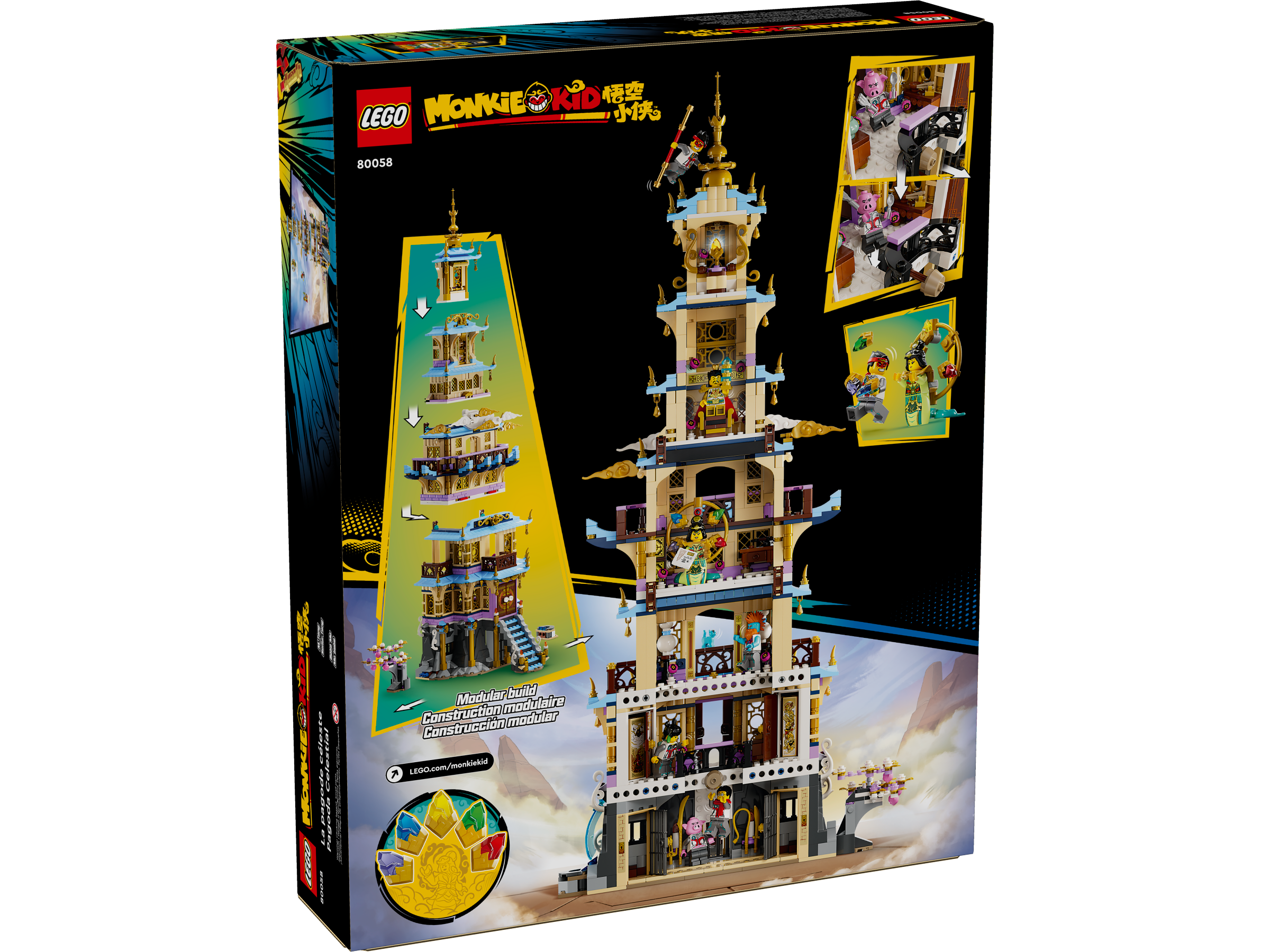 Enchant fantasy fans and kids aged 10 with a detail-packed building toy to explore as a creative family bonding activity in this Celestial Pagoda (80058) LEGO® Monkie Kid™ set. The cool gift has a pagoda with 6 levels in 4 sections, including a prison, library, a detailed throne in the throne room, a tower room with a Color Stone holder, and much more. This set includes 7 minifigures: Nüwa (with a Color Stone headpiece), Monkie Kid, Mei, Pigsy, Mr. Tang, Sandy, Li Jing, plus Baby Mo the cat.