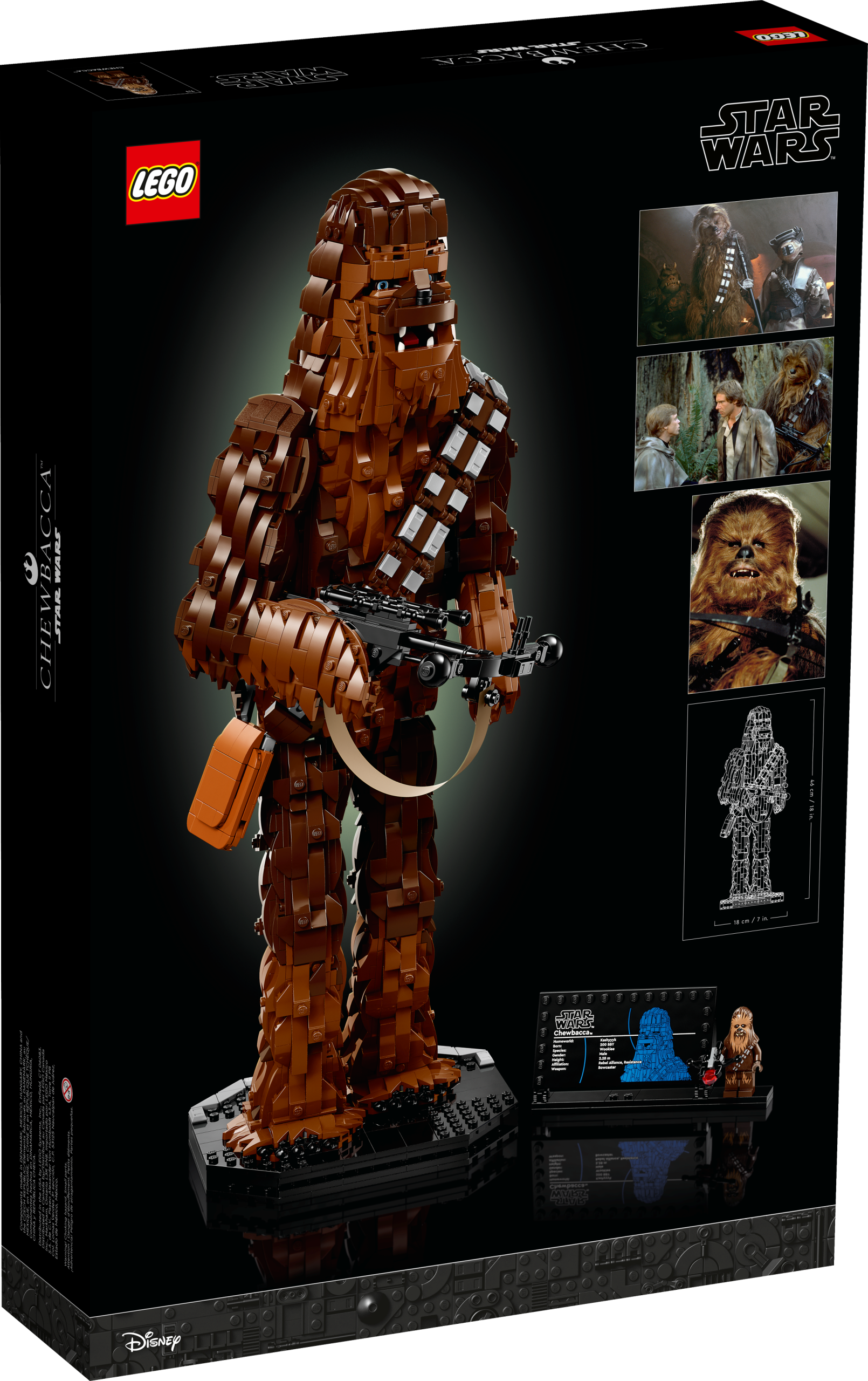 Mark the 40th anniversary of Star Wars: Return of the Jedi by creating a fitting tribute to a legendary Wookiee with this LEGO® Star Wars™ Chewbacca (75371) build-and-display figure. Channel your creative Force to recreate his hairy body in LEGO style and build his bandolier and giant bowcaster. This impressive buildable LEGO figure stands over 46 cm (18 in.) tall and has a built-in display stand. The set also includes a plaque with information about the character, plus a Chewbacca LEGO minifigure with a stud-shooting bowcaster.
