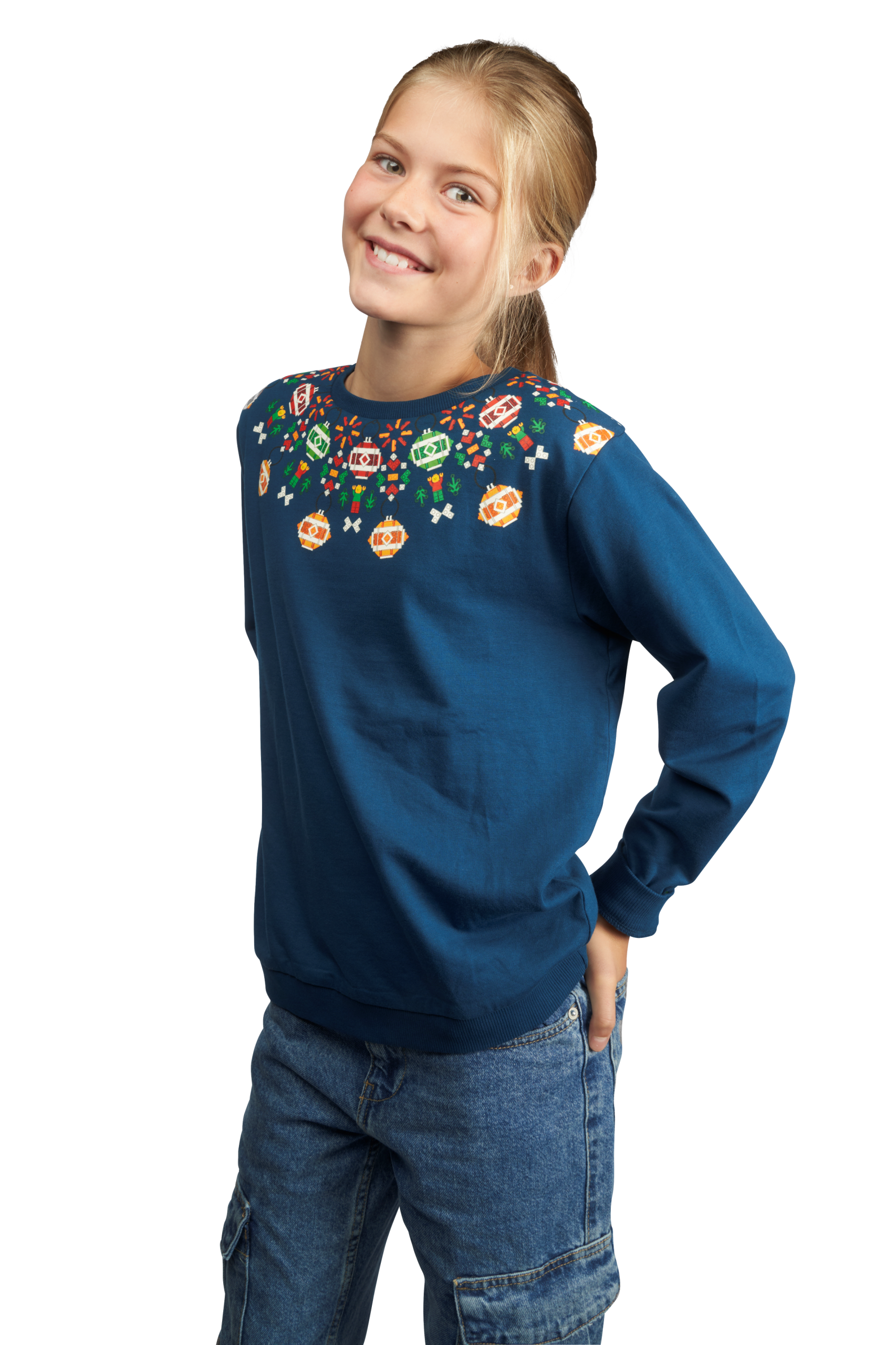 Celebrate the iconic LEGO® brick with this stylish blue LEGO Christmas jumper for kids. Machine washable and made from 100% cotton for ultimate comfort, it features illustrations on the front and back of Christmas ornaments and wreaths made of LEGO bricks. A fun gift idea for kids, this cool item of LEGO clothing is cut in a unisex style and is available in various sizes for ages 4 to 12. The model pictured is 128 cm tall and wears the 138/140 cm sweatshirt for ages 9 to 10.