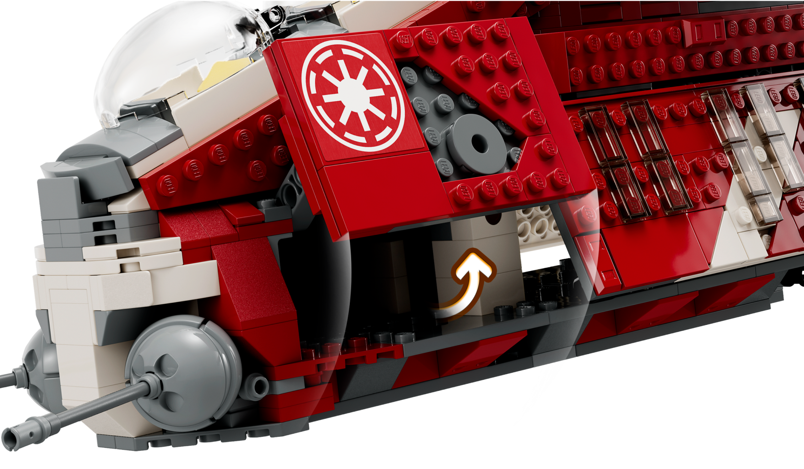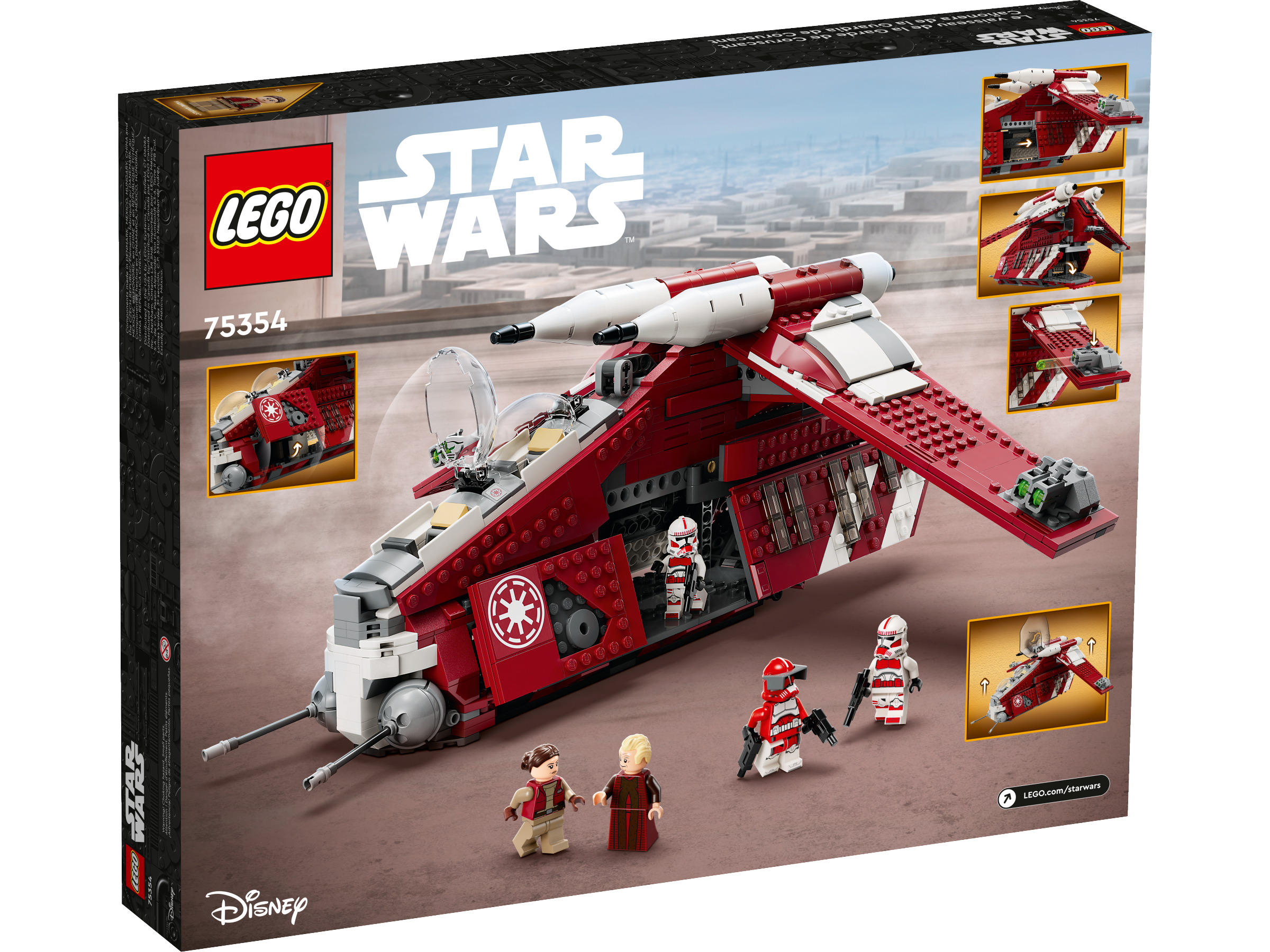 Fans can take command of their own Star Wars: The Clone Wars missions with this LEGO® brick Coruscant Guard Gunship (75354). It features 2 pilot cockpits, 2 stud shooters, 2 adjustable cannons and a handle for flying. The rear hatch and sliding side panel give easy access to the cabin where there is space for troopers. A top Star Wars™ gift idea for kids aged 9 and up, the set also includes 5 LEGO minifigures, including Commander Fox, Chancellor Palpatine and Padmé Amidala, plus 3 blaster pistols and 2 blasters for action play.