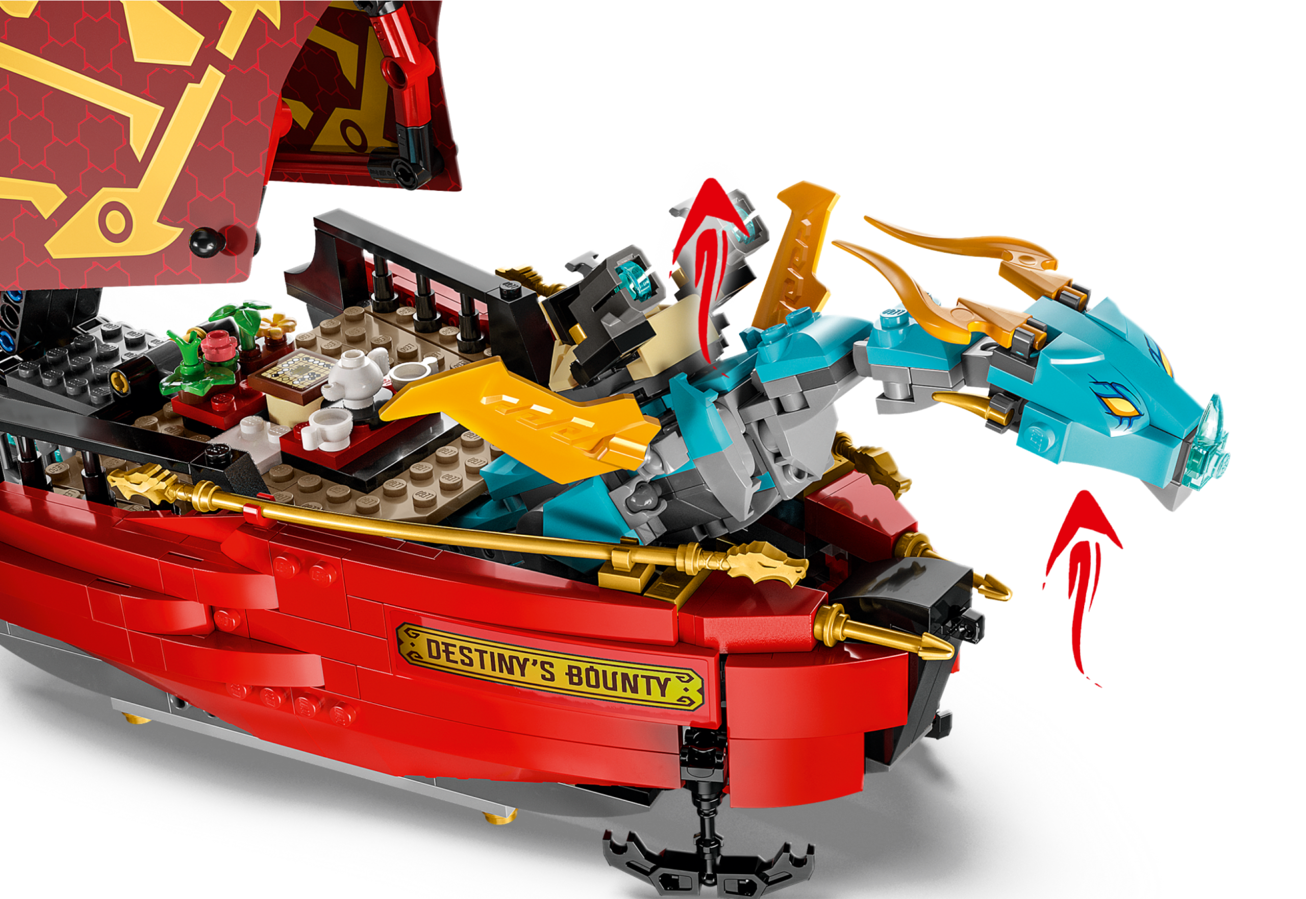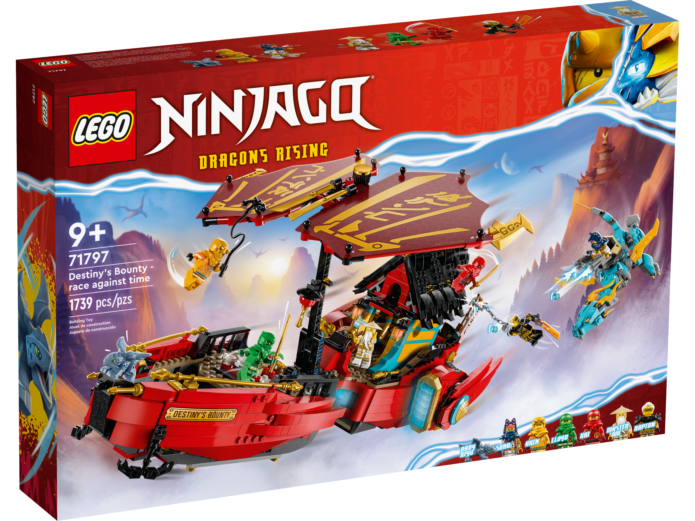The premium playset comes with aBaby Riyu model and 6 minifigures: Master Wu with his staff, Arin with a grappling hook, Sora, Lloyd and Kai, who each have a golden katana, and Rapton with an Imperium sword and his own grappling hook for imaginative kids to play out gripping scenes from the NINJAGO® Dragons Rising TV series.