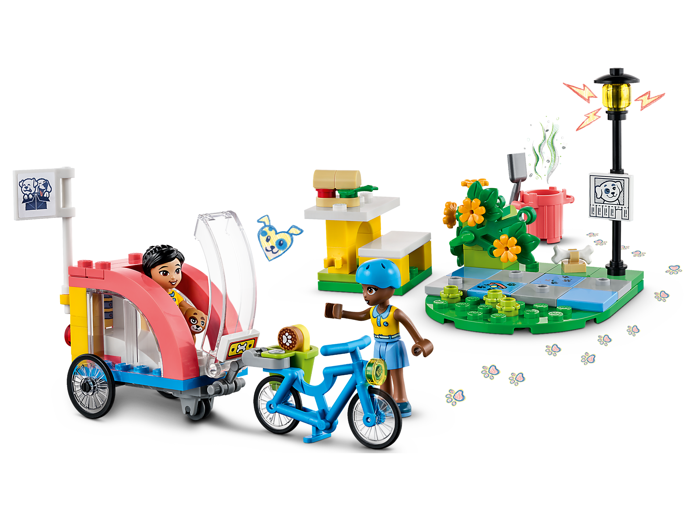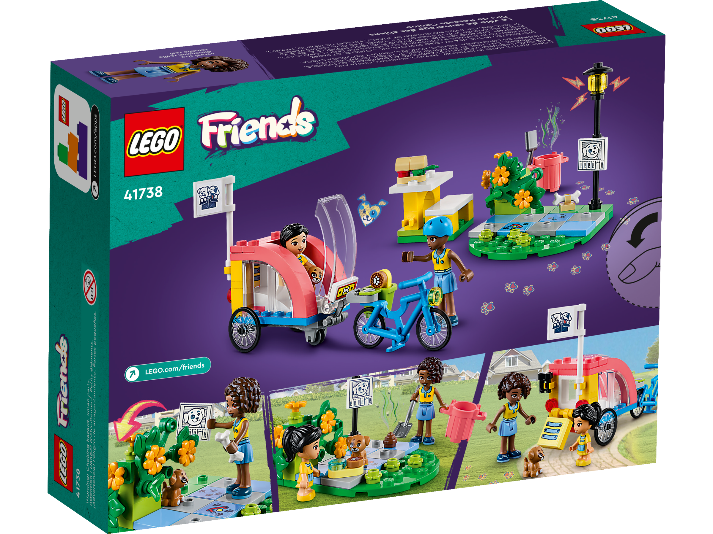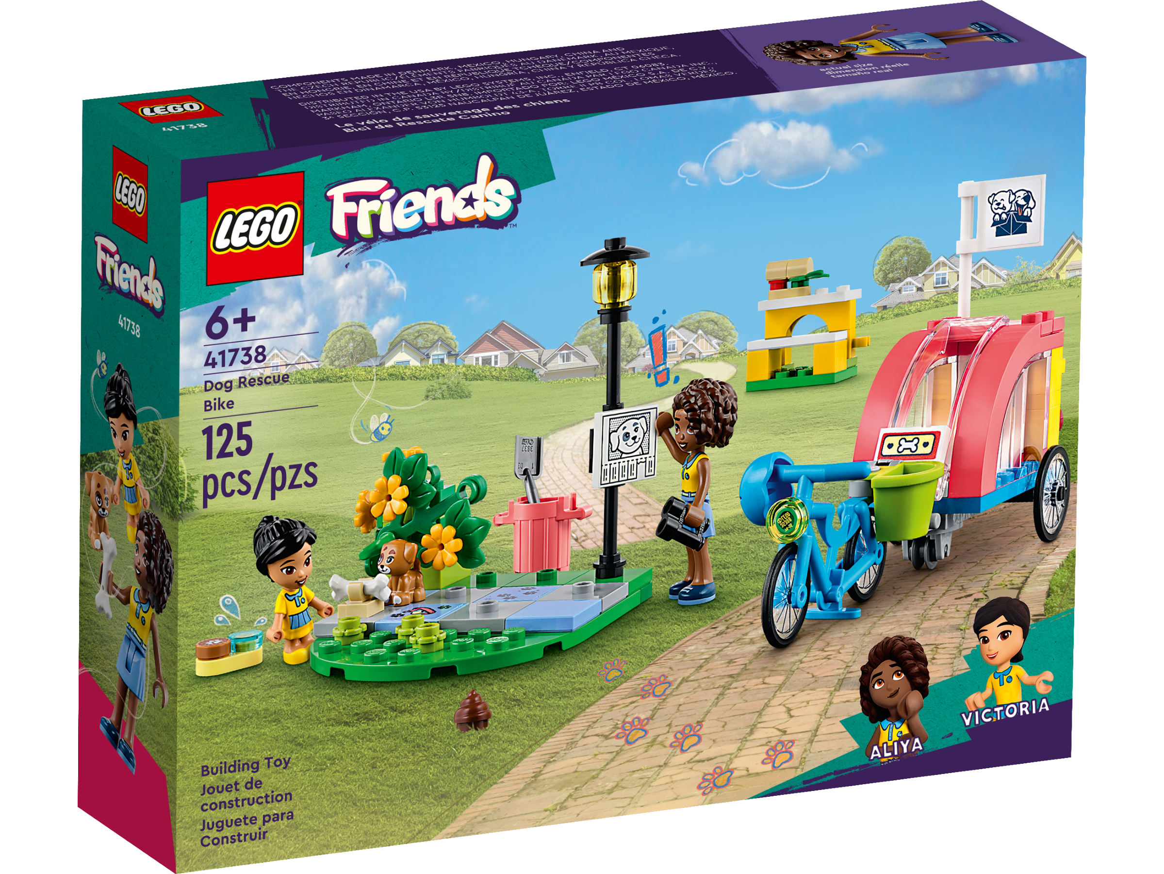 Pet-loving kids aged 6 and up can enjoy endless role-play adventures with this LEGO® Friends Dog Rescue Bike (41738) building toy set. They can search Heartlake City with scout leader Aliya and younger friend Victoria to find the missing pup. Kids will love the dog poop and paw mark clues! This cool toy set includes a dog rescue bike with a removable trailer that opens from the front and the back. There is also a small park scene with a bench and a bush that lifts to reveal the lost puppy, plusaccessories to help kids find and care for the pooch.
