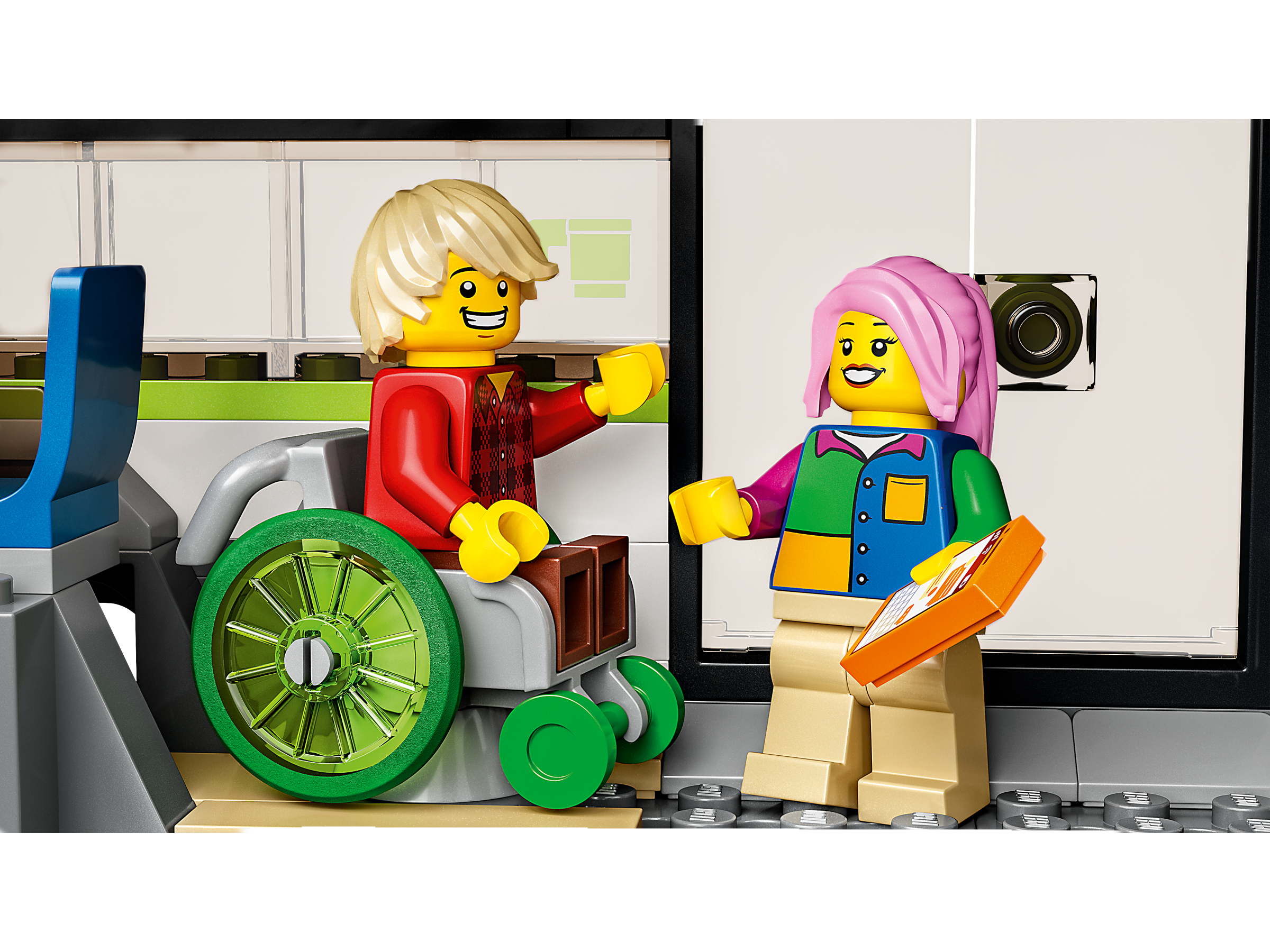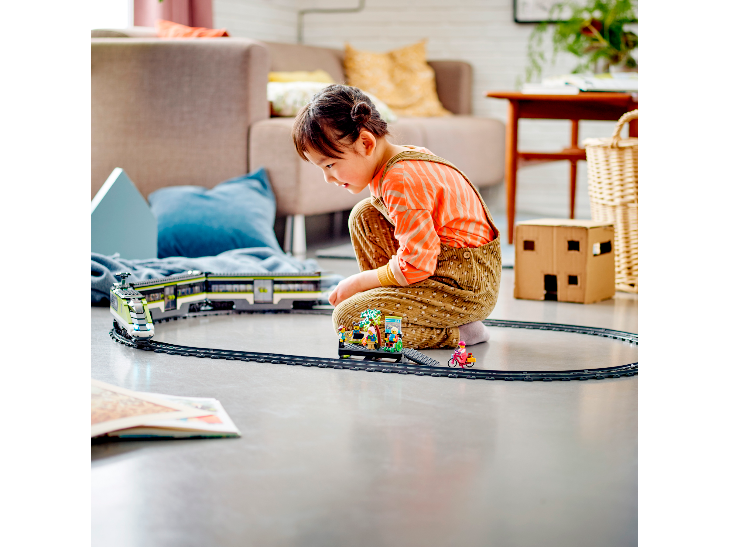 The LEGO® City Express Passenger Train set (60337) includes a remote-controlled bullet locomotive with working, dimmable headlights and LEGO Powered Up technology, a dining car, passenger car, station platform, 24 track pieces and 6 minifigures for endless hours of train-themed role play.