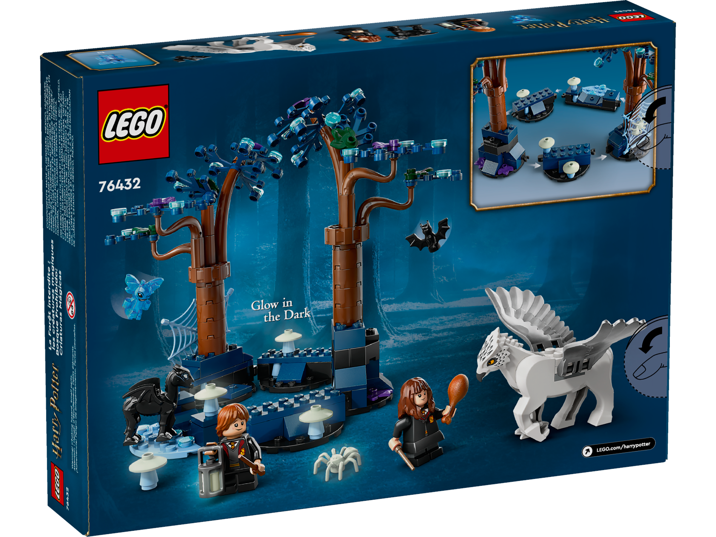 Build a LEGO® brick Forbidden Forest™ full of magical creatures with this LEGO Harry Potter™ fantasy toy playset for kids (76432). It features trees with leaf elements in nighttime colours, plus a glow-in-the-dark toy spider and 4 glow-in-the-dark mushrooms to create an enchanted atmosphere. The set includes 2 LEGO minifigures – Ron Weasley™ and Hermione Granger™ – plus a Buckbeak™ toy figure, a baby Thestral figure and a Cornish Pixie figure for role play. Children can also rearrange the modules in this customisable toy set to create a variety of scenes.