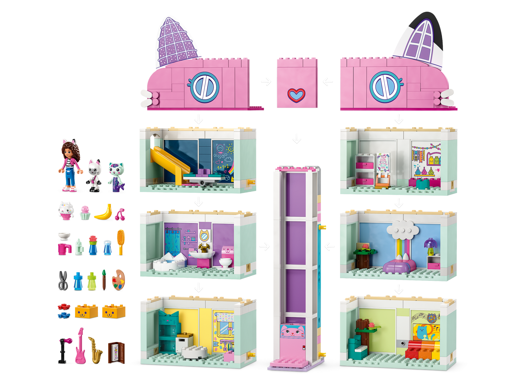 Gabby’s Dollhouse features 8 colorful rooms connected by a sliding elevator. Each room is filled with activities. For example, kids can bake in the kitchen, use a slide in the playroom, get creative in the art room, play piano in the music room, pamper themselves in the bathroom, take a nap in the bedroom or head to the rooftop for a party on the rotatable dance floor. Kids share their adventures with 4 popular characters from the show: Gabby, Pandy Paws, Cakey and MerCat. There’s a picture-story building guide, and the LEGO Builder app has intuitive zoom and rotate tools. A large Starter Brick ensures the building fun begins right away.