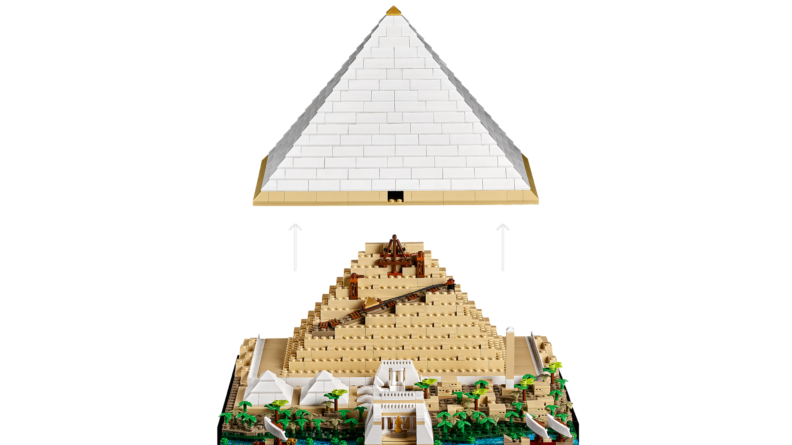 Take an imaginative leap back in time to the 26th century BC and experience the building of one of the Seven Wonders of the Ancient World with this LEGO® Architecture Great Pyramid of Giza model (21058). Build a beautifully detailed cross-section model of the Great Pyramid, revealing its main tunnels and chambers and the system that may have been used to move huge stones during its construction. Visualise how this area by the River Nile is thought to have looked in ancient times, with 2 small pyramids, 2 mortuary temples, Sphinx statues, an obelisk and more.