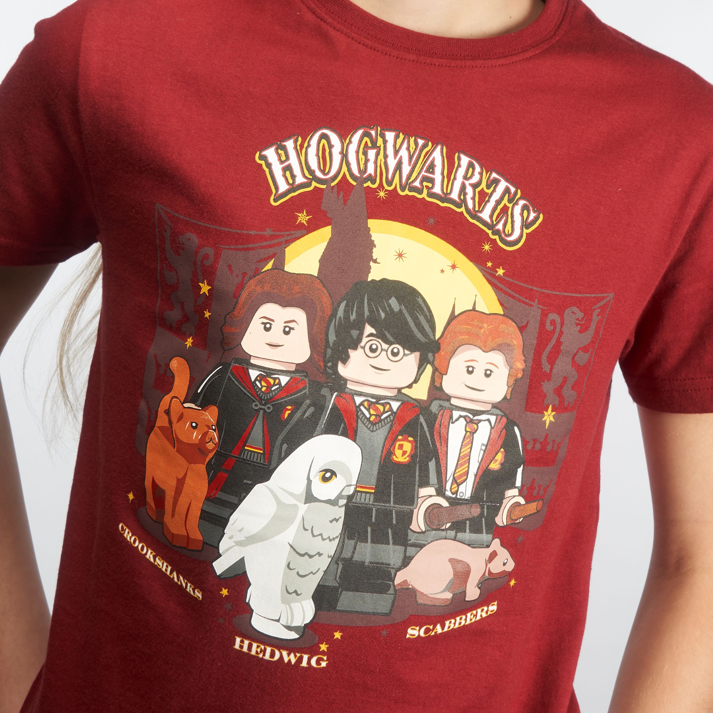 Let young fans wear their love for iconic Hogwarts™ students and their pets with this unisex LEGO® Harry Potter™ T-Shirt. It features a screen-printed illustration of Harry Potter, Hermione Granger™ and Ron Weasley™ LEGO minifigures with their pets Hedwig™, Crookshanks and Scabbers™. A magical fashion gift idea for kids, this burgundy red, machine-washable, 100% cotton tee is available in various sizes for ages 4 to 14.
