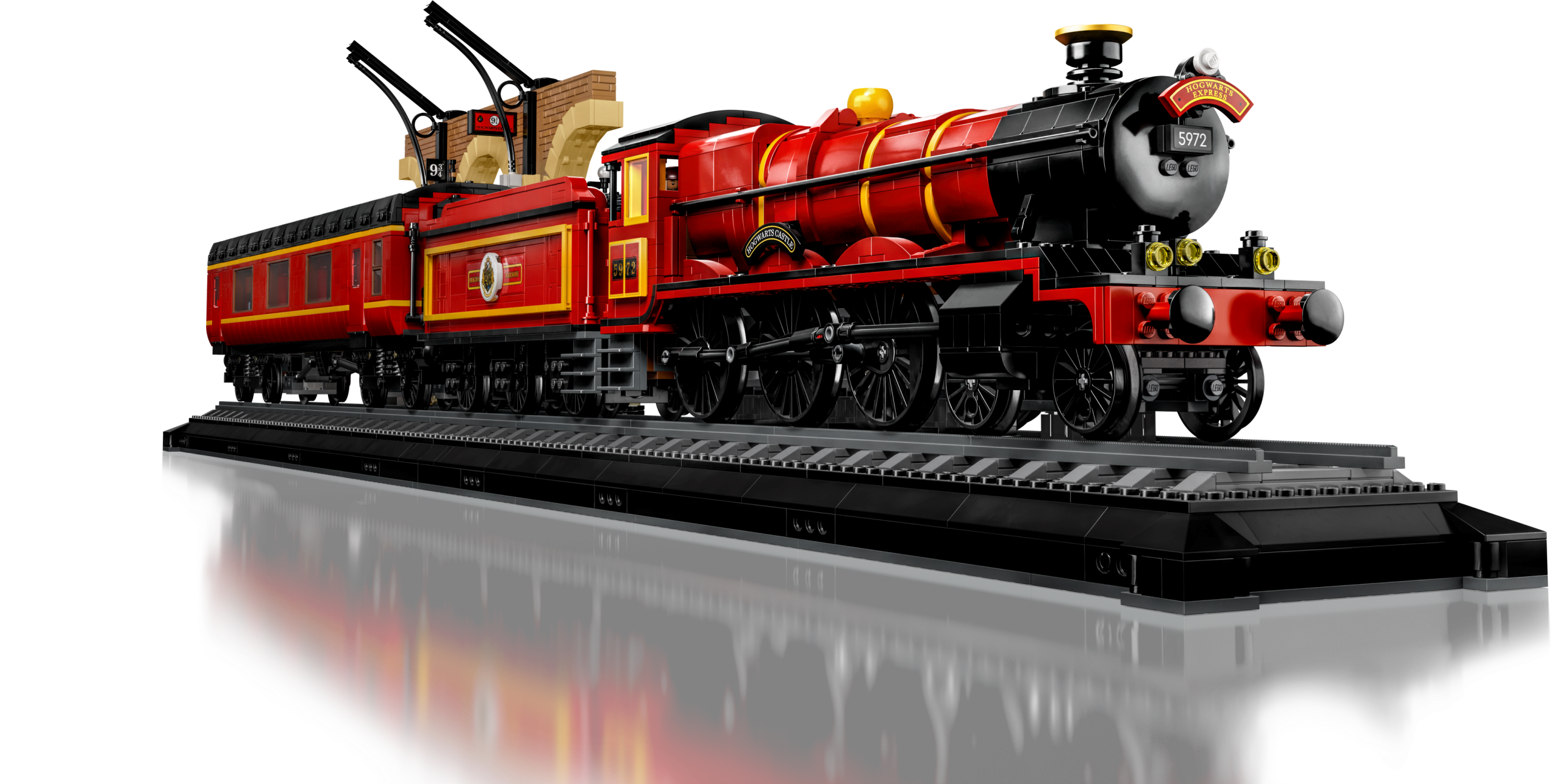 The engine features a detailed underside and a lever on the top that causes the train to rock with the motion of a steam train. A tender carries the engine’s supply of coal. The passenger carriage comprises 3 compartments, each depicting a classic scene: when Harry, Ron and Hermione meet in the series’ first film; when Professor Lupin saves Harry from the Dementor™ in the third film; and when Luna saves Harry from Draco’s spell in the sixth film. The model also depicts Platform 9¾ at King’s Cross Station, where the adult Harry and Ginny wait with their children, Lily, James and Albus, ready for Albus’s first trip aboard the amazing Hogwarts Express.