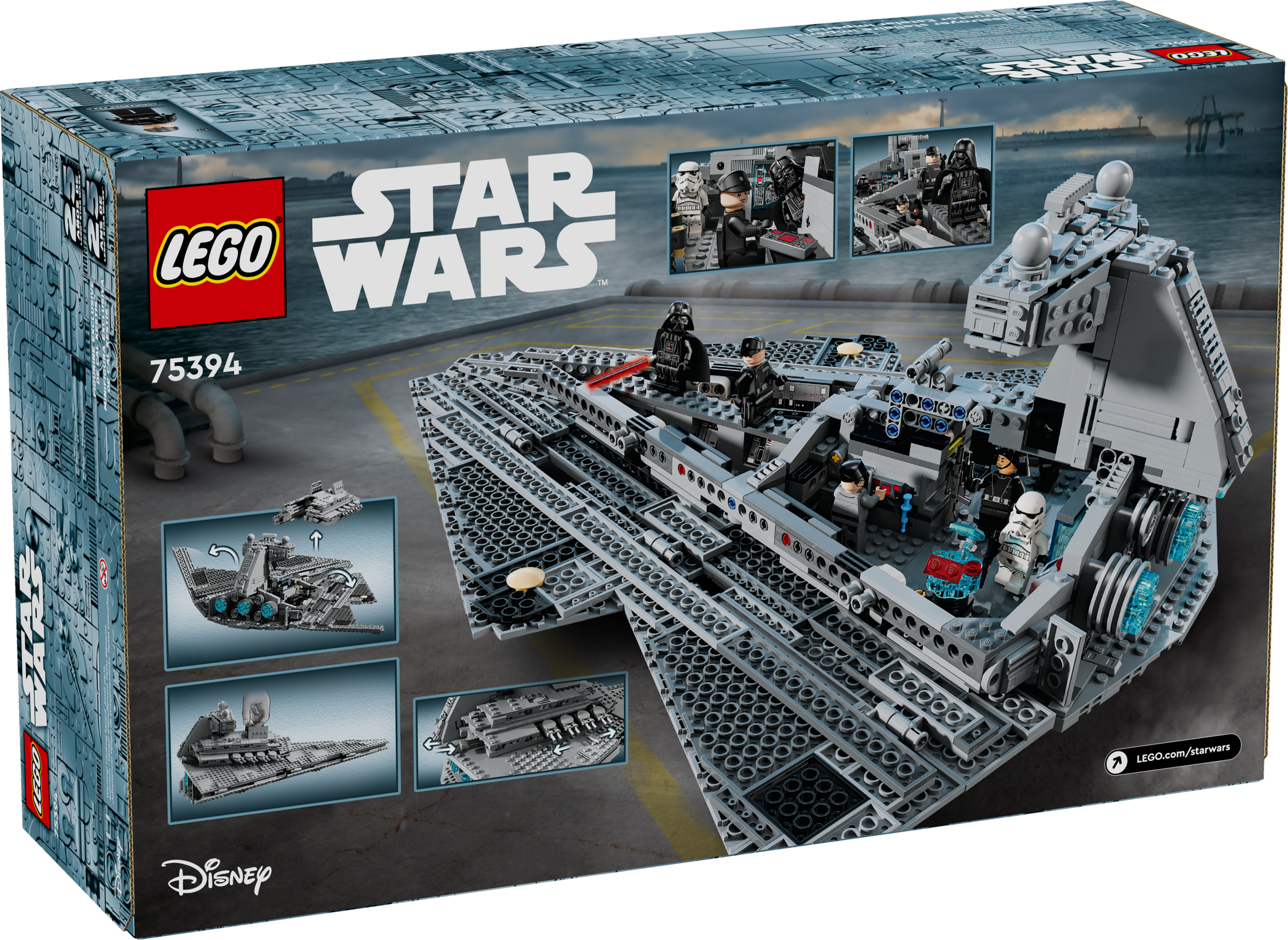 Dominate the galaxy with this LEGO® Star Wars™ Imperial Star Destroyer buildable toy starship playset for kids (75394). A cool birthday gift for boys, girls and fans aged 10 and up, this Star Wars starship building toy features a hidden foldout carry handle for flying and 2 spring-loaded shooters, with a lift-off top panel and foldout side panels for easy access to the detailed interior. Playful details inside include the bridge, command room, break room, armory, control panels and cargo box with thermal detonator elements.