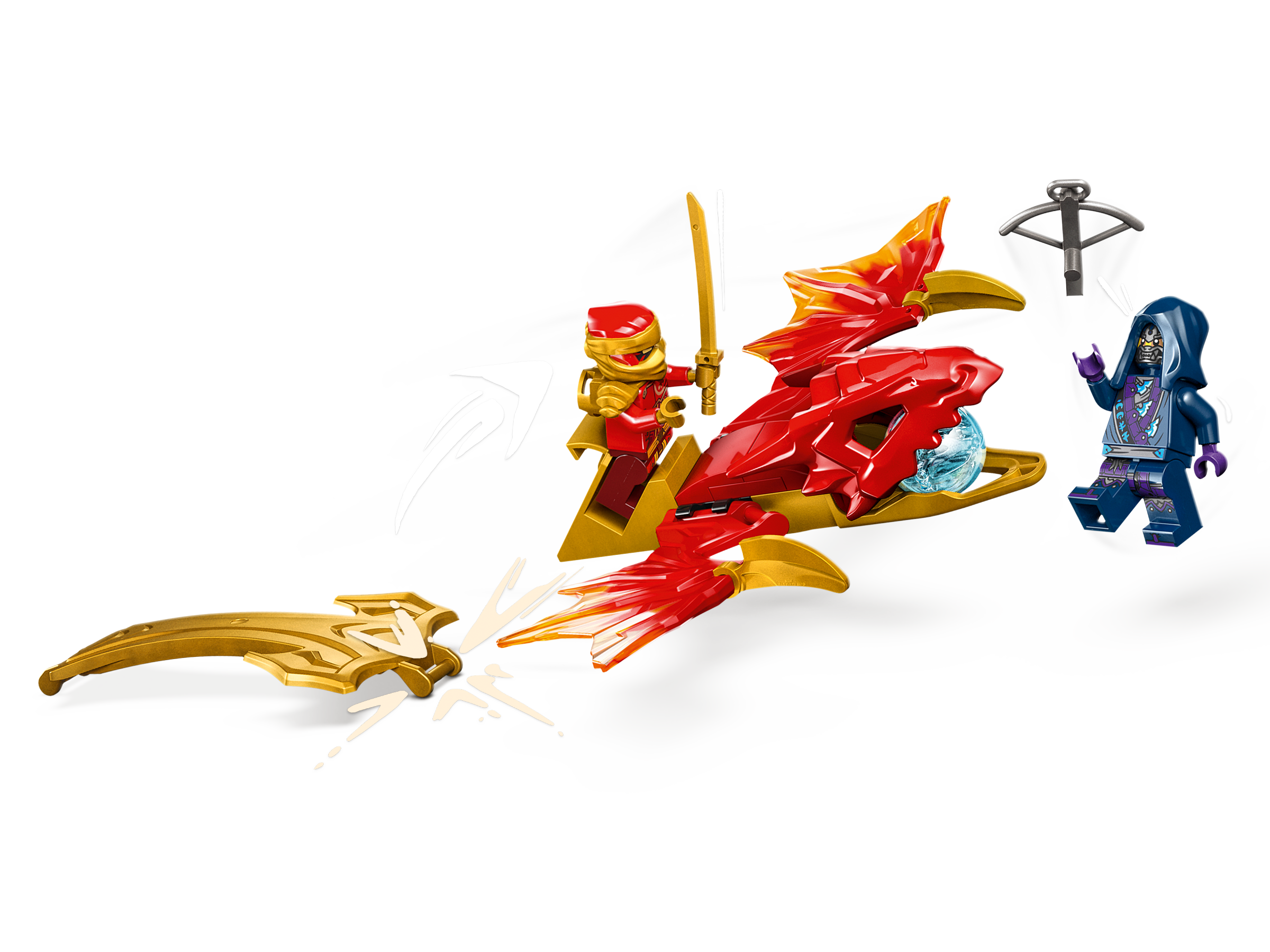 This playset comes with 2 minifigures: Rising Dragon Kai, who comes with a katana sword accessory and can ride the buildable dragon action figure, and a Wolf Mask Guard witha crossbow accessory. Kids can stage battles between these LEGO NINJAGO characters to win a blue dragon power element from the dragon action figure toy’s posable mouth.