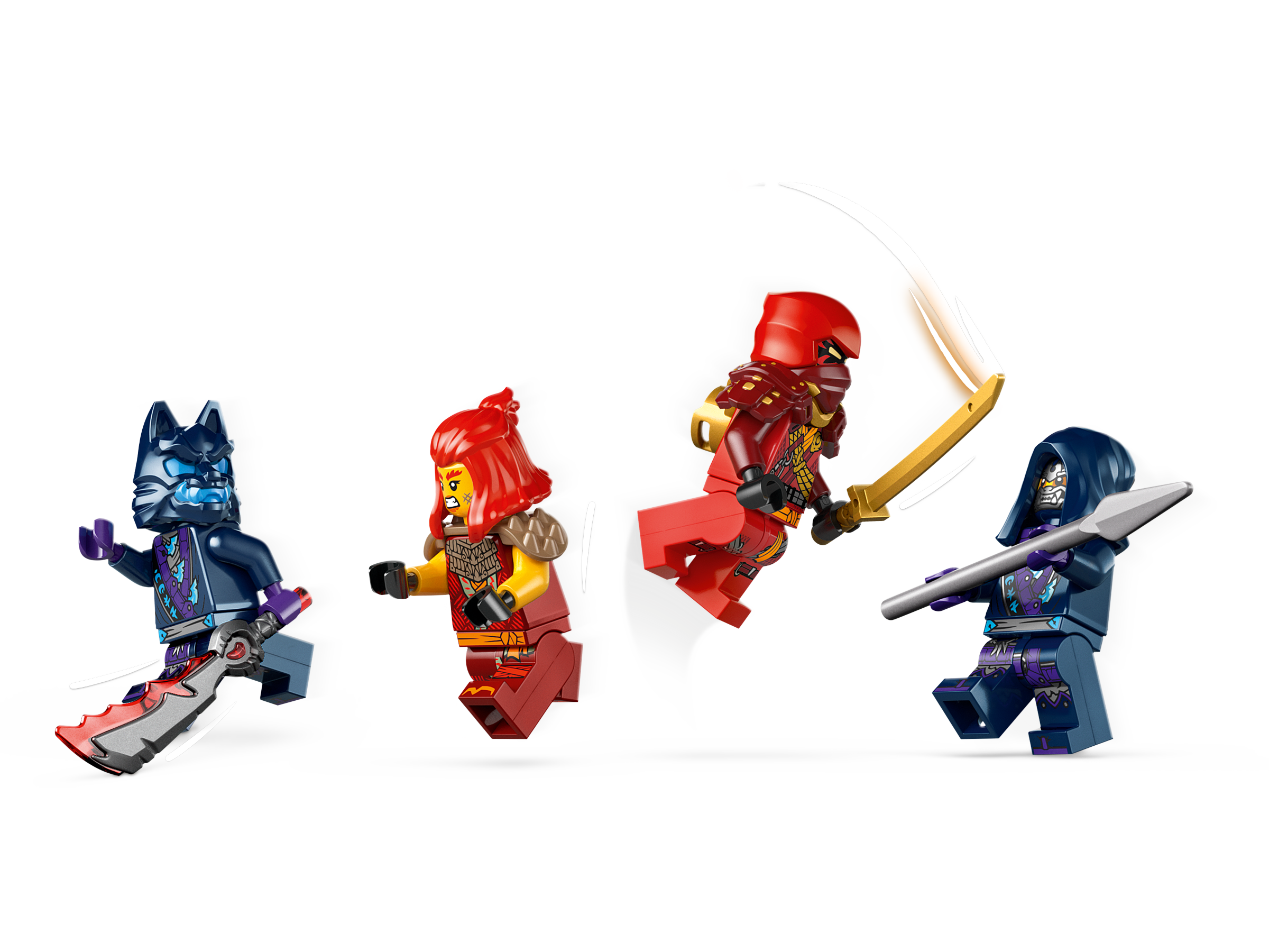 This LEGO building toy for kids comes with 4 minifigures: Climber Kai with a katana sword accessory, Wyldfyre with a katana sword accessory, a Wolf Mask Guard with a spear and a Wolf Mask Warrior with a sword accessory. There is also a small forest build to trap characters, a powerful shooter vehicle that can fire a large arrow and 3 small flame elements.