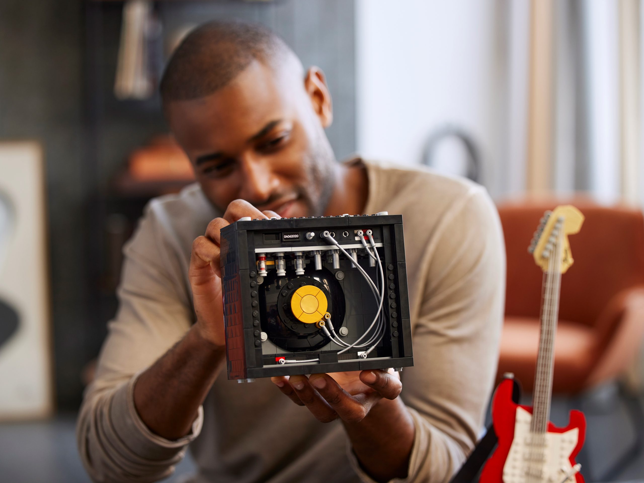 Create your own brick-built 1970s Fender® Stratocaster™ guitar and 65 Princeton® Reverb amplifier with this LEGO® Ideas set (21329). Recall the legendary musicians who have played a Stratocaster® as you recreate its iconic curves and add authentic details such as the posable whammy bar, pickup switch and tuning pegs. The buildable amp has removable panels for easy viewing of the motherboard, reverb tank, speaker and other interior details, plus rubber cables to connect it to the guitar and footswitch.