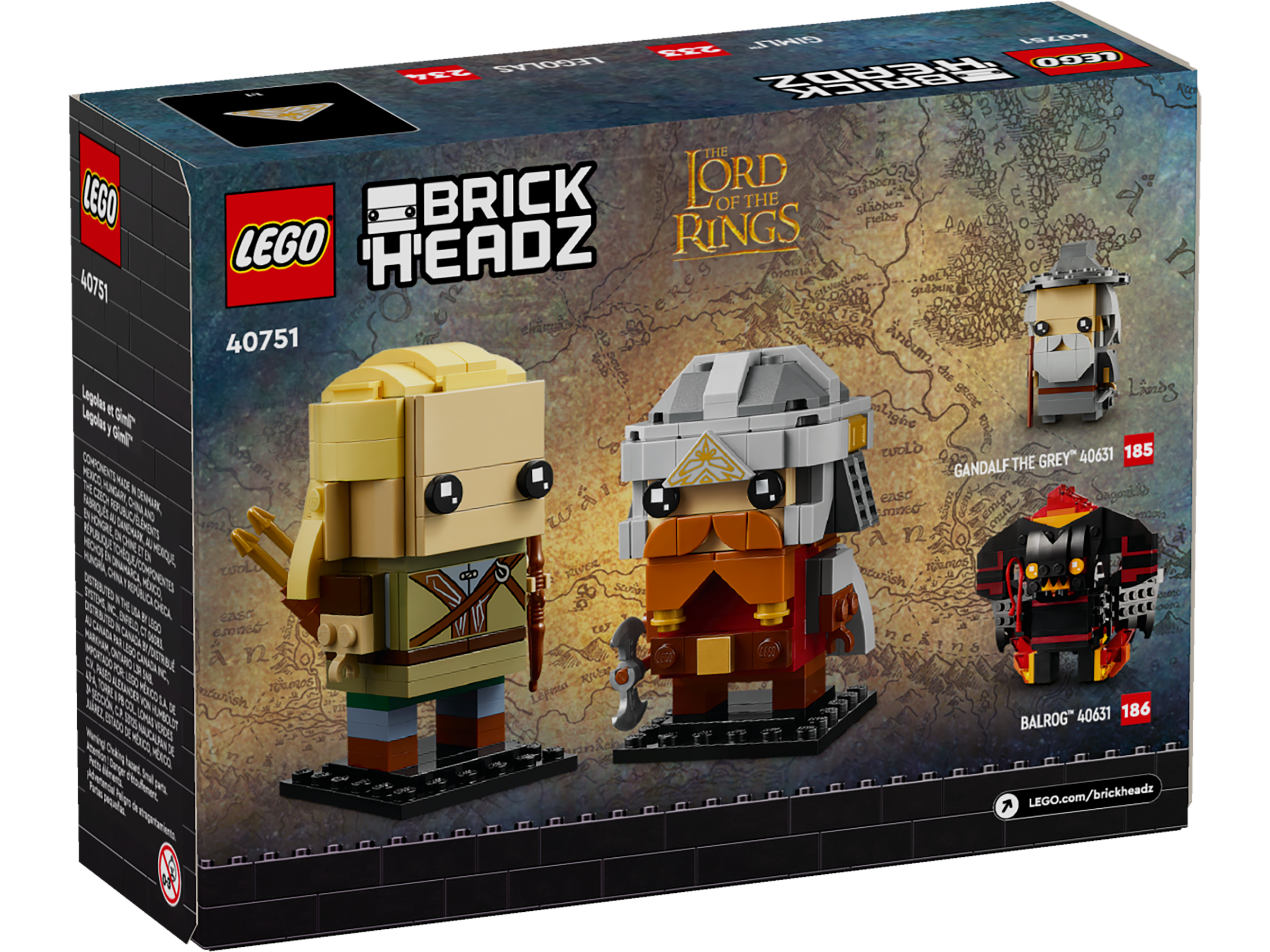 Rekindle memories of epic Fellowship of the Ring adventures with LEGO® BrickHeadz™ Legolas & Gimli™ (40751) figures. Both models in this The Lord of the Rings™ hero toy building set for kids aged 10 and up have instantly recognizable decorations to delight fans. The Legolas figure holds a bow-and-arrow element and the Gimli figure has an axe. A fun The Lord of the Rings gift idea for boys, girls and any fan, this collectible set is part of an extensive LEGO BrickHeadz assortment.