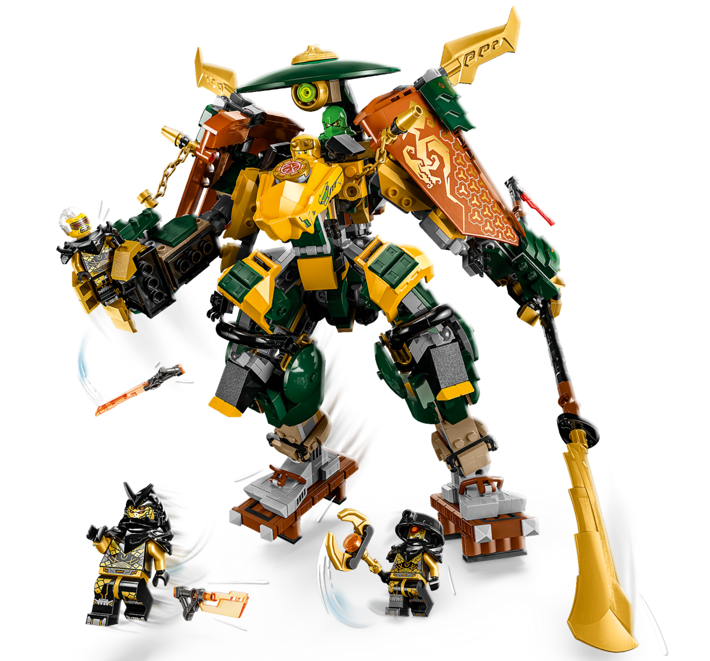 Kids aged 9 can play out exhilarating training and battle scenes from the NINJAGO® Dragons Rising TV series with Lloyd and Arin’s Ninja Team Mechs (71794). This never-before-seen building set features ninja master Lloyd’s and his student Arin’s posable mechs, which can be merged to create 1 larger and heavily armed mech for endless play opportunities.