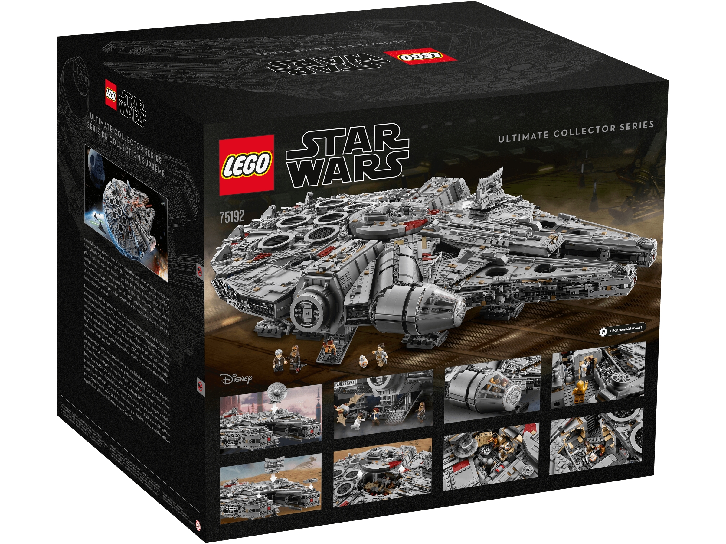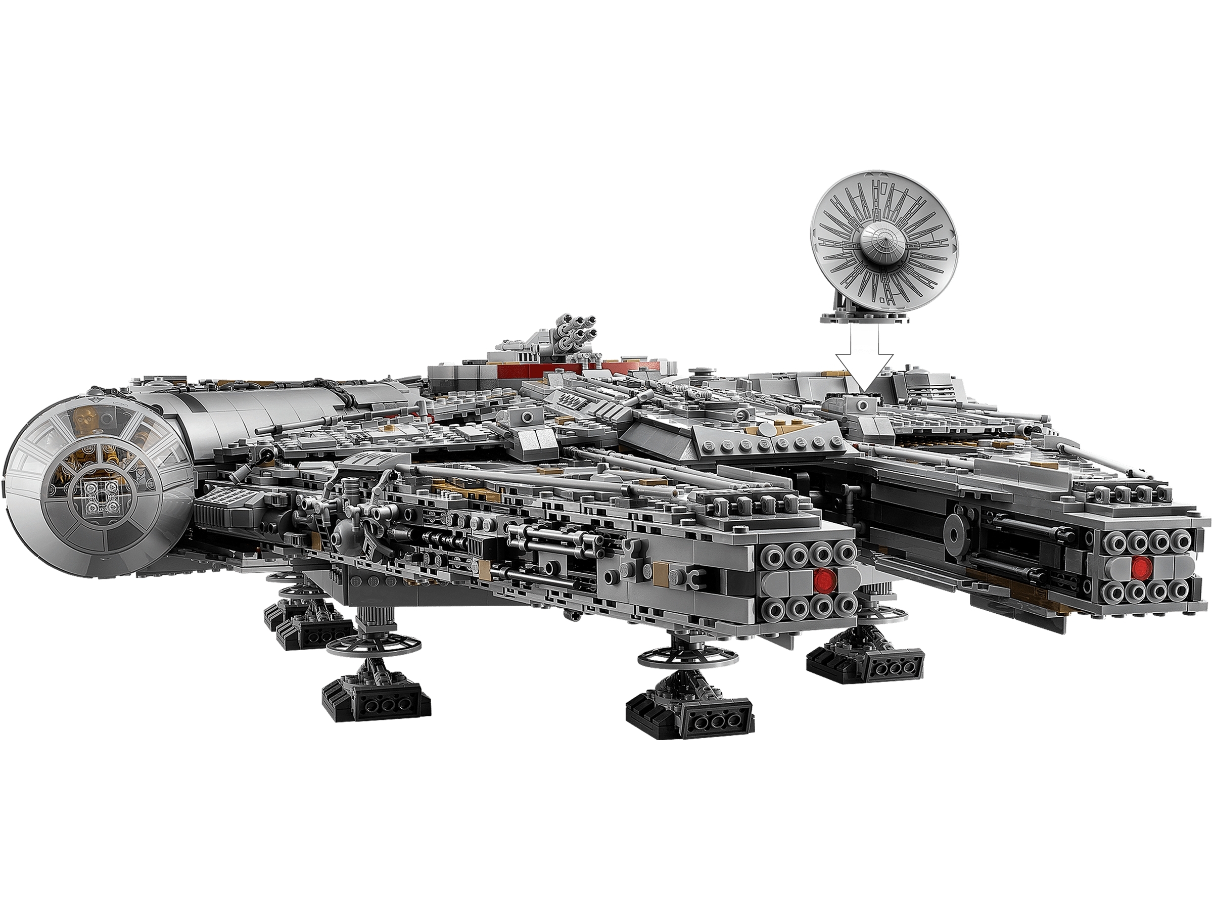 Welcome to the largest, most detailed LEGO® Star Wars Millennium Falcon model we’ve ever created—in fact, with 7,500 pieces it’s one of our biggest LEGO models, period! This amazing LEGO interpretation of Han Solo’s unforgettable Corellian freighter has all the details that Star Wars fans of any age could wish for, including intricate exterior detailing, upper and lower quad laser cannons, landing legs, lowering boarding ramp and a 4-minifigure cockpit with detachable canopy. Remove individual hull plates to reveal the highly detailed main hold, rear compartment and gunnery station. This amazing model also features interchangeable sensor dishes and crew, so you decide whether to play out classic LEGO Star Wars adventures with Han, Leia, Chewbacca and C-3PO, or enter the world of Episode VII and VIII with older Han, Rey, Finn and BB-8!