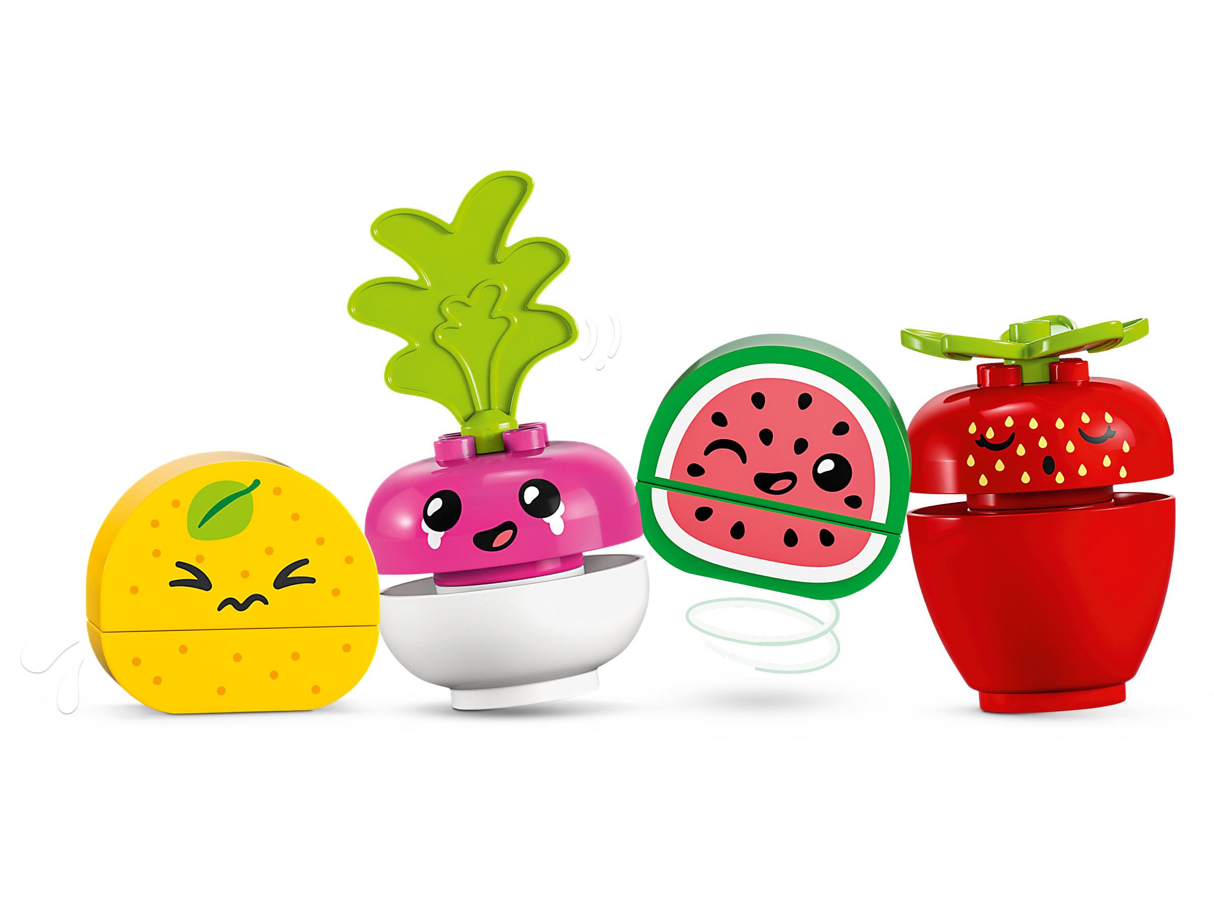 Kids can learn about balance as they stack the radish, strawberry, lemon and watermelon toys. All LEGO DUPLO sets are designed to develop self-expression – in this one, each piece of food wears a different expression to bring the creative play to life!