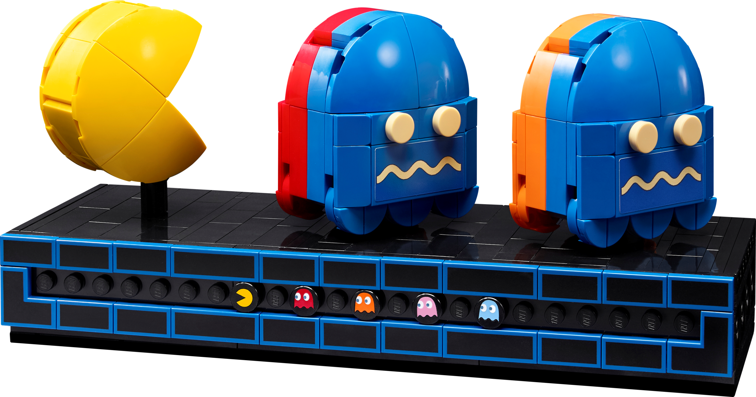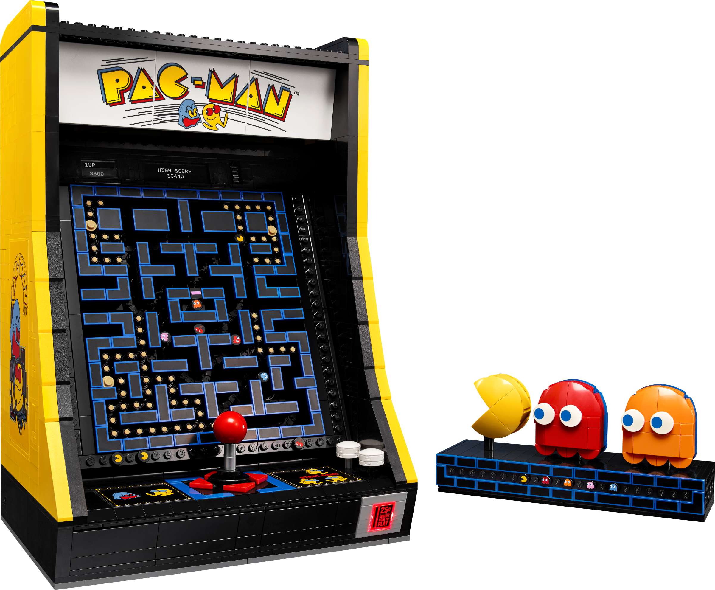 Authentic detailingThis LEGO replica is loaded with retro design details and fun features, including a 4-way joystick and an illuminating coin slot. Turn the handle to activate a mechanical maze that simulates the classic chase between your favourite characters or open the back panel to view the mechanical elements. There’s even a 1980s arcade scene to build, complete with a gaming minifigure and a display case with rotatable PAC-MAN, BLINKY and CLYDE figures.