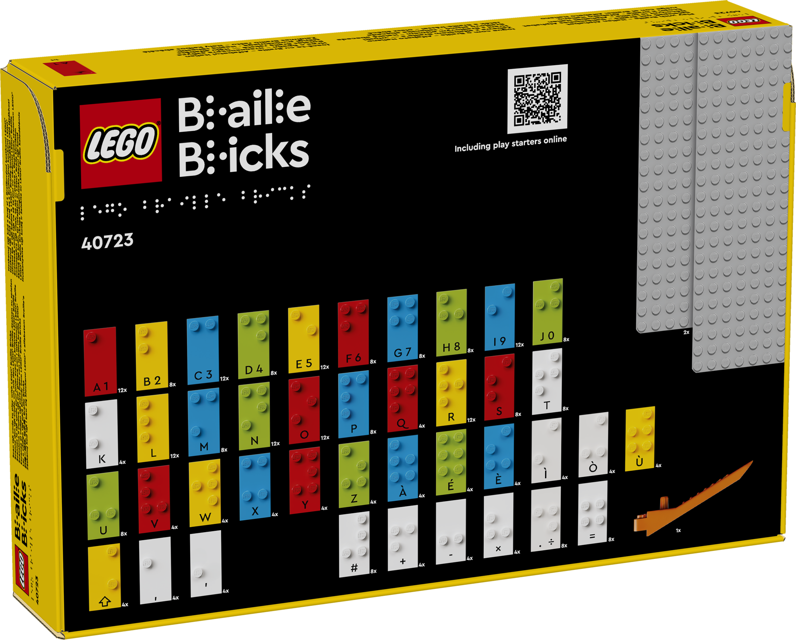 The LEGO® Play with Braille – Italian Alphabet (40723) set contains 287 LEGO braille bricks, including letters from the Italian alphabet, numbers, special signs and base plates. A complementary educational tool for visually impaired kids aged 6 and their loved ones, it aids learning through play. For an introduction to the Play with Braille experience, play starters are available on LEGO.com to help learners understand the brick system and how the bricks link to the braille code characters.