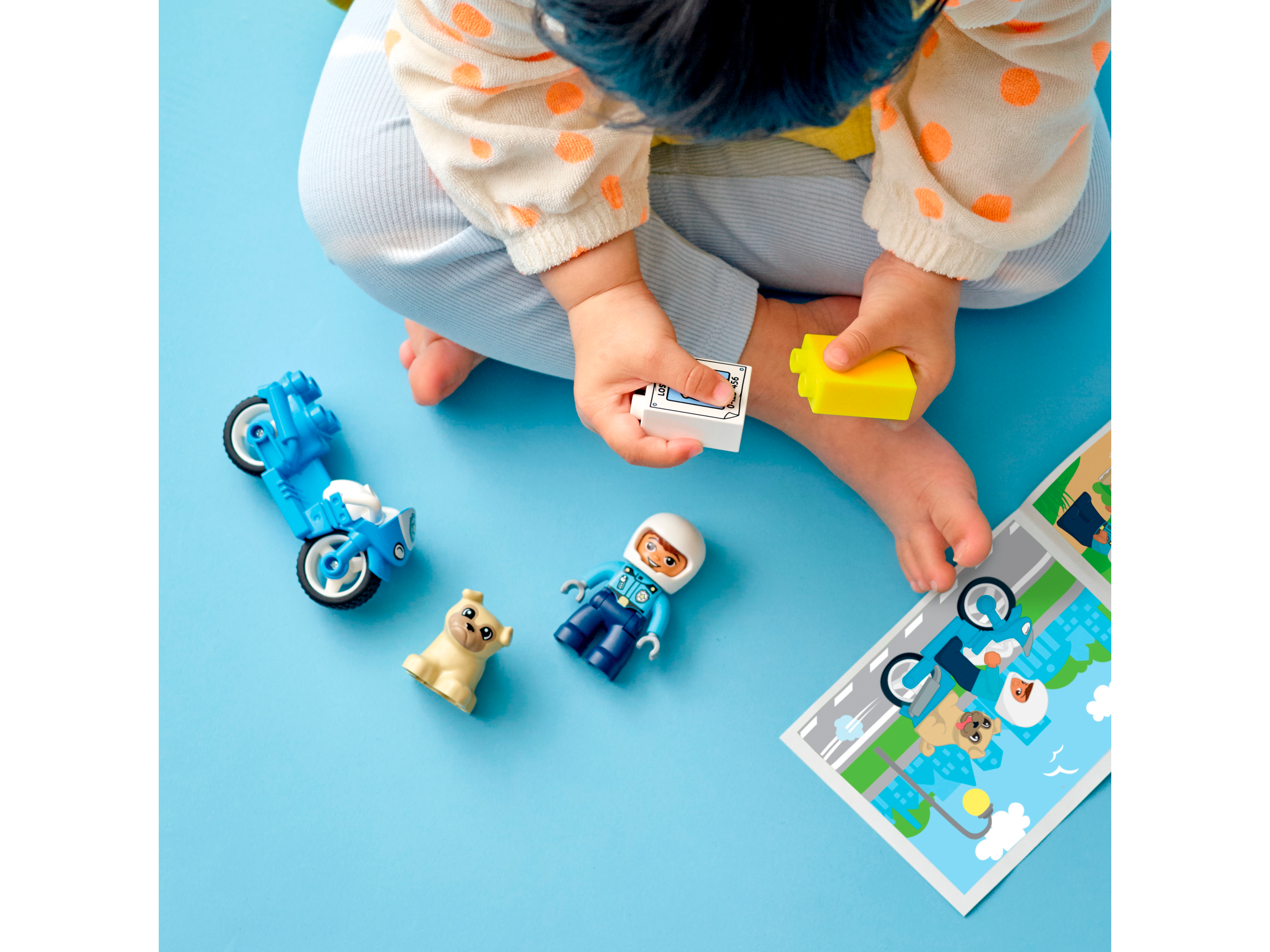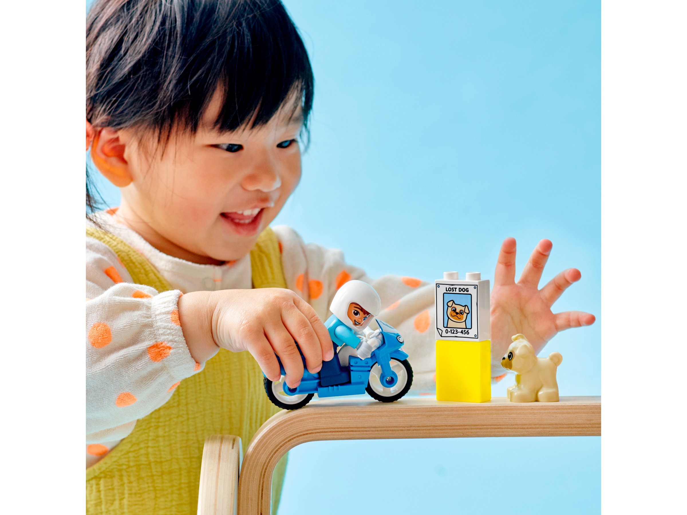 LEGO® DUPLO® Rescue Police Motorcycle (10967) provides hands-on developmental play that will delight any preschooler aged 2 with an interest in police work, cool motorcycles and caring for animals.