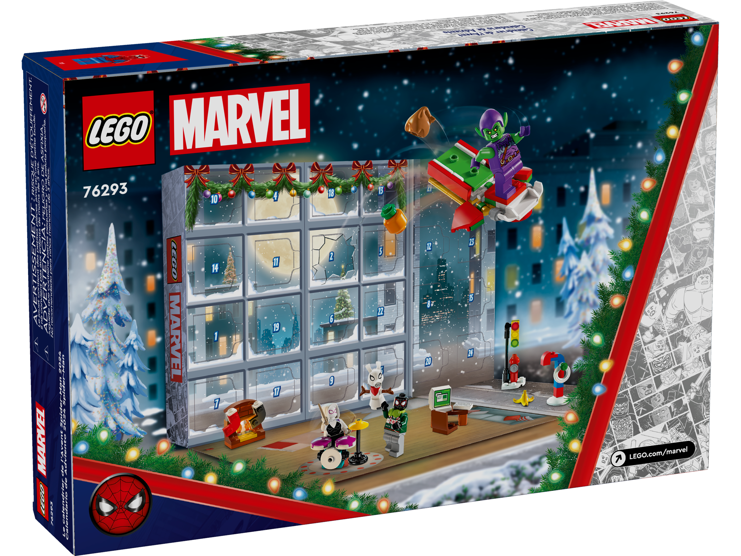Behind each of the 24 doors is a daily gift for kids to discover throughout the buildup to Christmas. There are 5 minifigures – Spider-Man, Green Goblin, Miles Morales, Ghost-Spider and Venom – plus small building toys and accessories that kids will recognize from the New York City street scenes in the Spider-Man movies. These include a snow Spider-Ham, Peter Parker’s desk andElectro’s winter tree. There are also 2 small cars that can be raced against each other and a Sandman catapult flinging presents! As the big day approaches, kids can mix up the gifts to create endless imaginative adventures of their own.