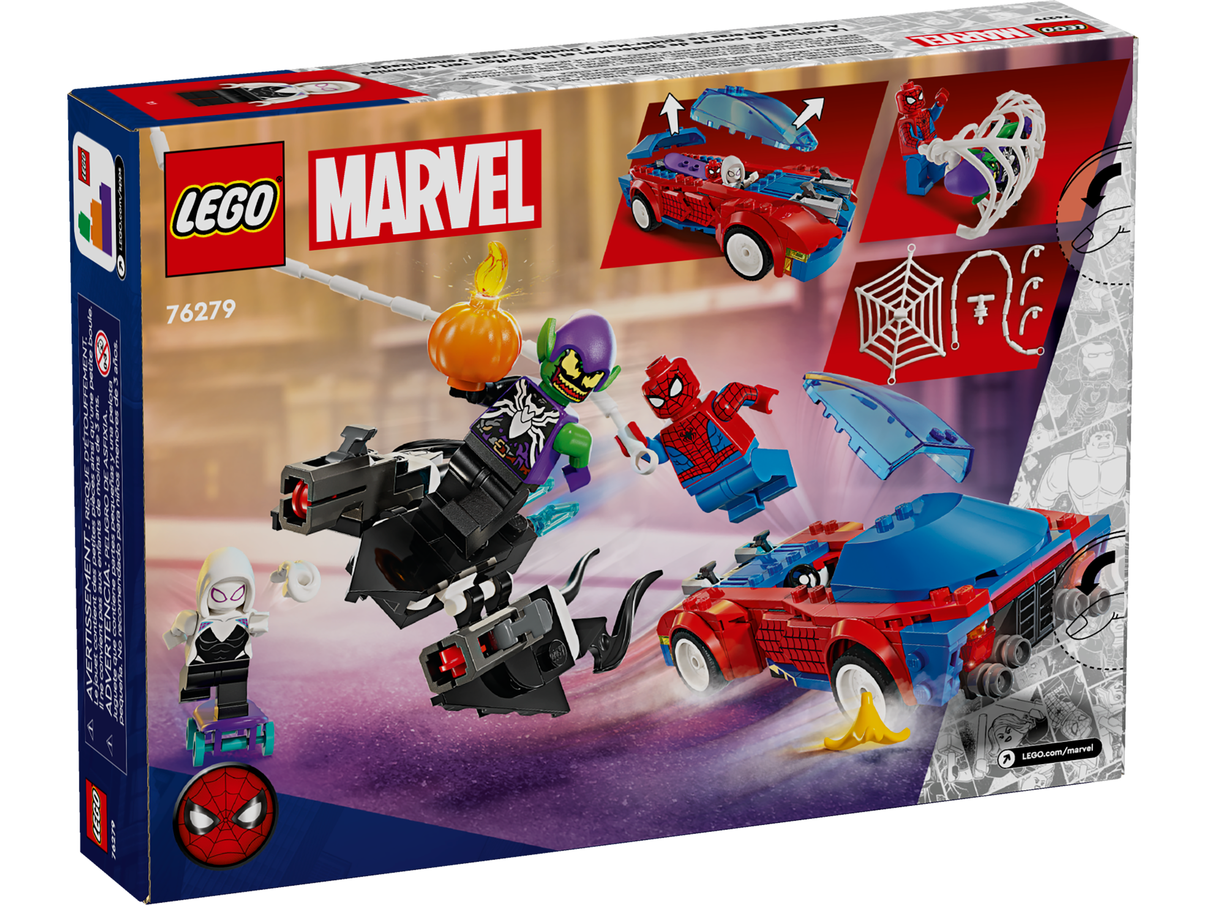 Spider-Man, Ghost-Spider and Venom Green Goblin engage in fast-moving battle action using an awesome assortment of vehicles, weapons and accessories. Spider-Man’s car has 2 front stud shooters, Green Goblin’s glider has 2 stud shooters and he carries pumpkin bombs, and Ghost-Spider uses 2 hand web blasters as she rides her skateboard. Spider-Man swings on a flexible web ‘rope’ and uses a large, bendable web to capture villains. Removable sections give access to the car’s interior, which is big enough to hold 2 minifigures and the skateboard. For added digital fun, builders can zoom in, rotate models in 3D and track their progress using the fun, intuitive LEGO Builder app.