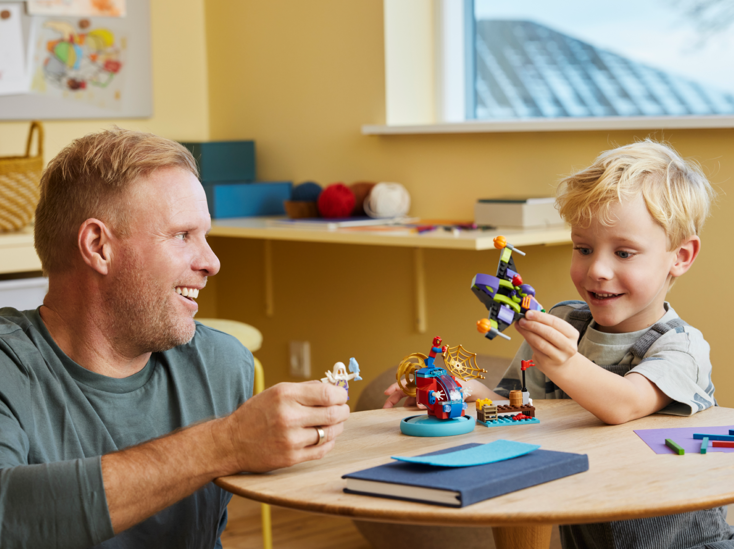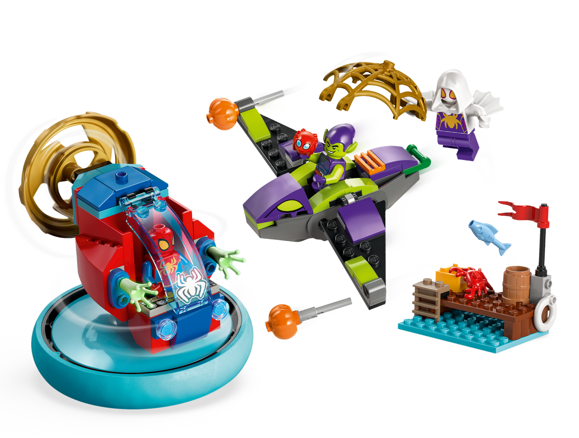 This Disney Spidey and His Amazing Friends toy vehicle set includes: a Spidey minifigure and his hover spinner with rotating propeller and lift-up cockpit; a Green Goblin minifigure and his glider with pumpkin projectiles; and a Ghost-Spider minifigure with her large, golden web element. There’s also Spidey’s robot friend Trace-E, sea accessories and a cute crab. The set comes with a cockpit Starter Brick to help get building underway and intuitive instructions in the form of a colourful picture-story guide.