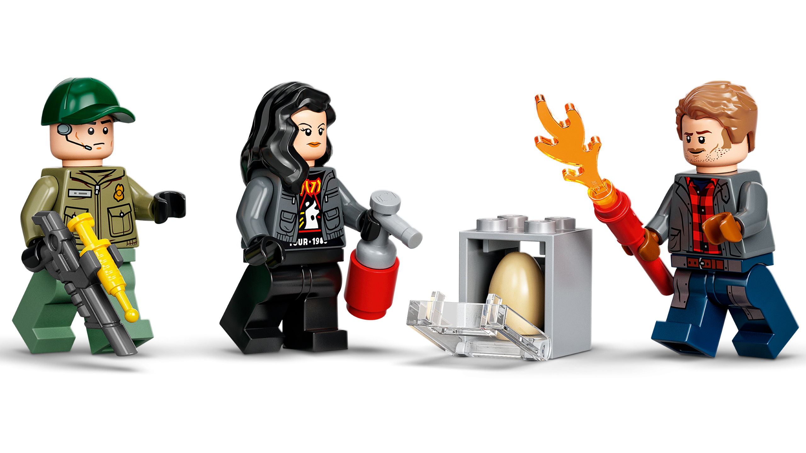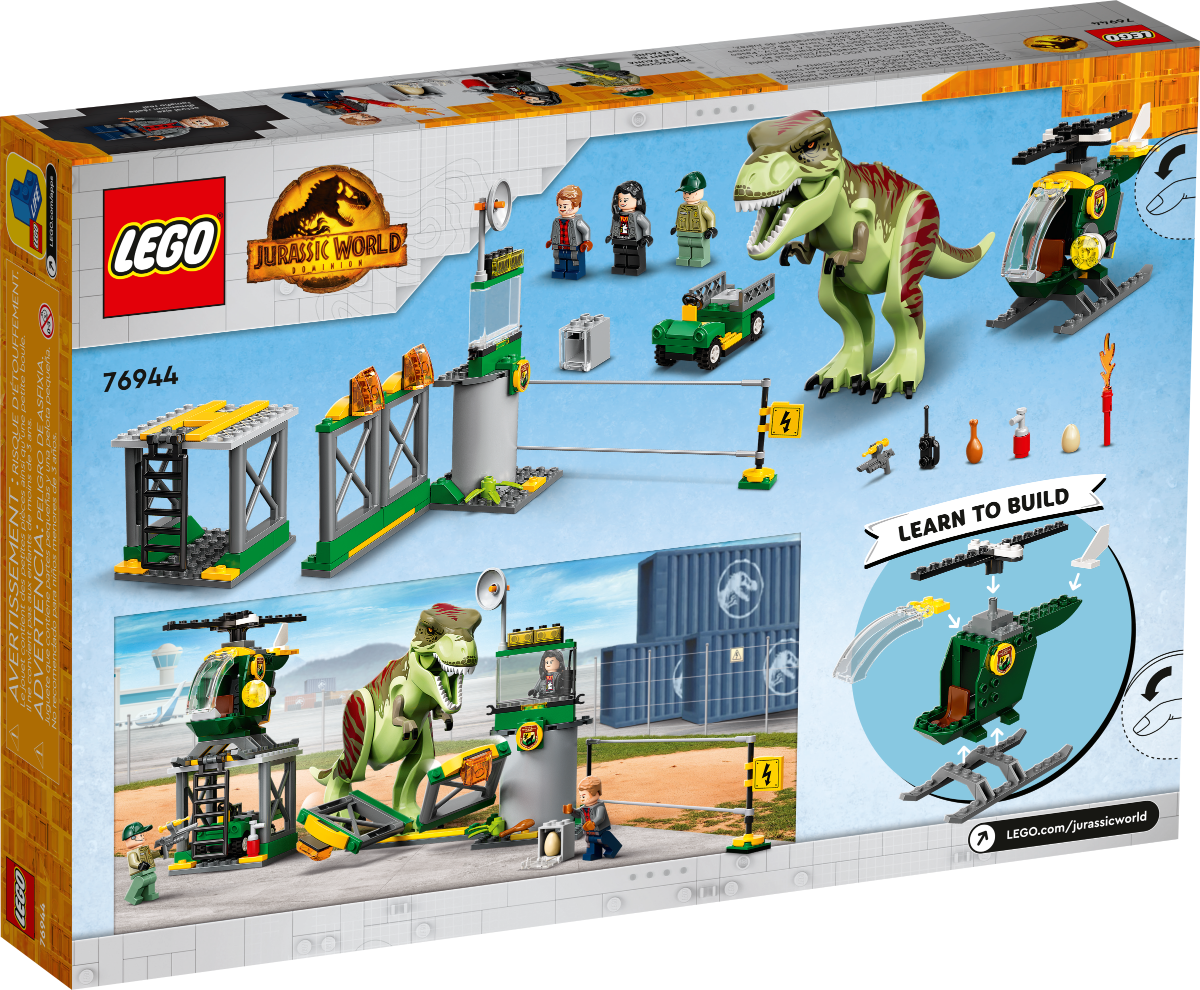 Youngsters who love dinosaurs and cool vehicles will enjoy learning to build with this LEGO® Jurassic World T. rex Dinosaur Breakout (76944) toy playset for kids aged 4 and up. It features an airport with a helipad, garage, helicopter, buggy and collapsible fence, plus a posable T. rex figure. There are also 3 minifigures – Owen Grady, Zia Rodriguez and a wildlife guard – with accessory elements such as a dinosaur egg and walkie-talkie to inspire imaginative play.