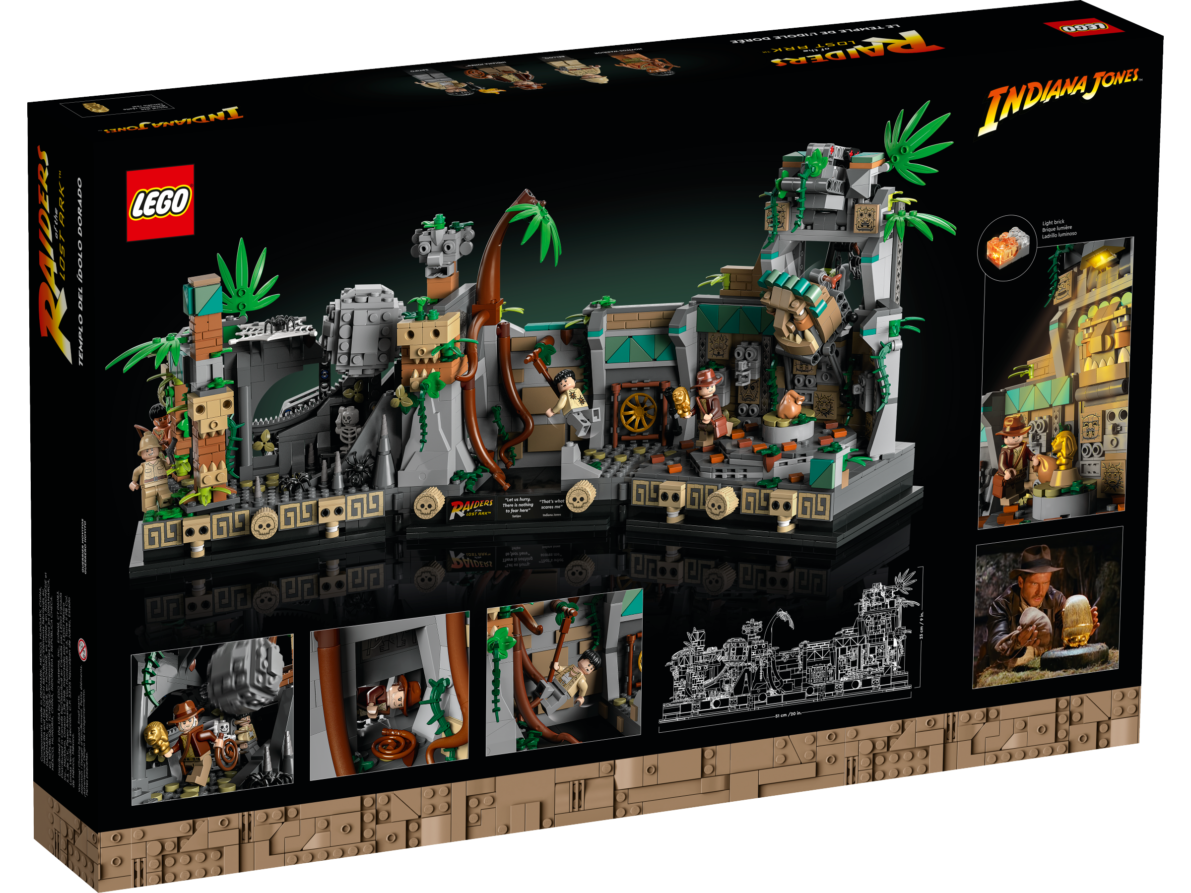 This LEGO Indiana Jones memorabilia model comes with 4 minifigures – Indiana Jones, Satipo, Belloq and a Hovitos Warrior – and is packed with interactive functions. The model features a plinth with 4 knobs that you can turn to lower and light up the idol, collapse a wall, swing Indiana Jones across a cavern, lower a trapdoor, and see Indy chased by a massive boulder.