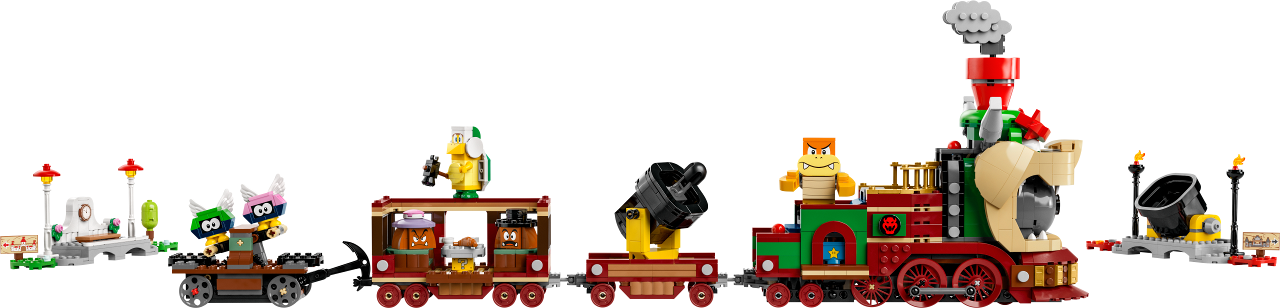 Add a LEGO® Mario™, LEGO® Luigi™ or LEGO® Peach™ figure (not included) for interactive play. Help them to chase the train in the handcar, operate the spinning platform on the locomotive and activate the cannon wagon’s spring-loaded shooter. Once all the enemies are defeated, trigger horn sounds as they drive Bowser’s Express to the station.