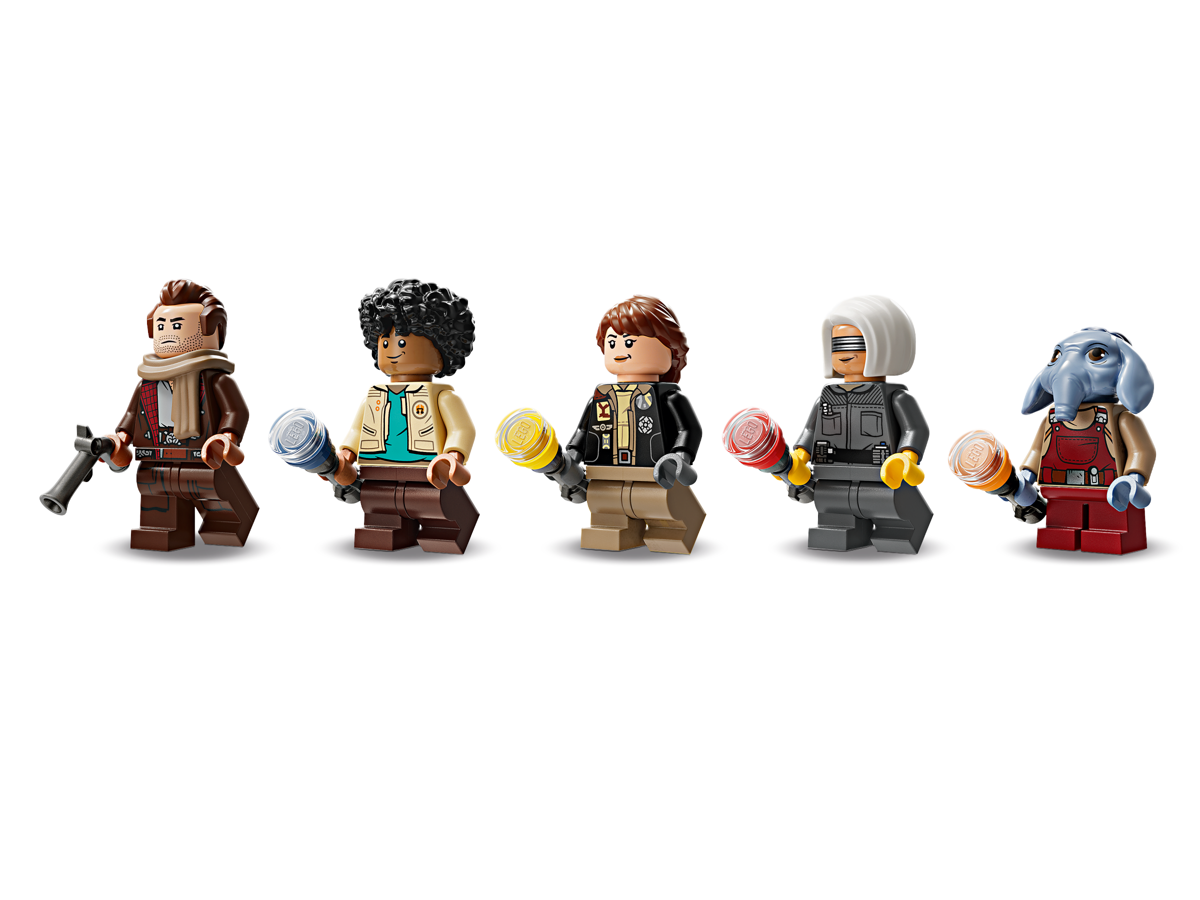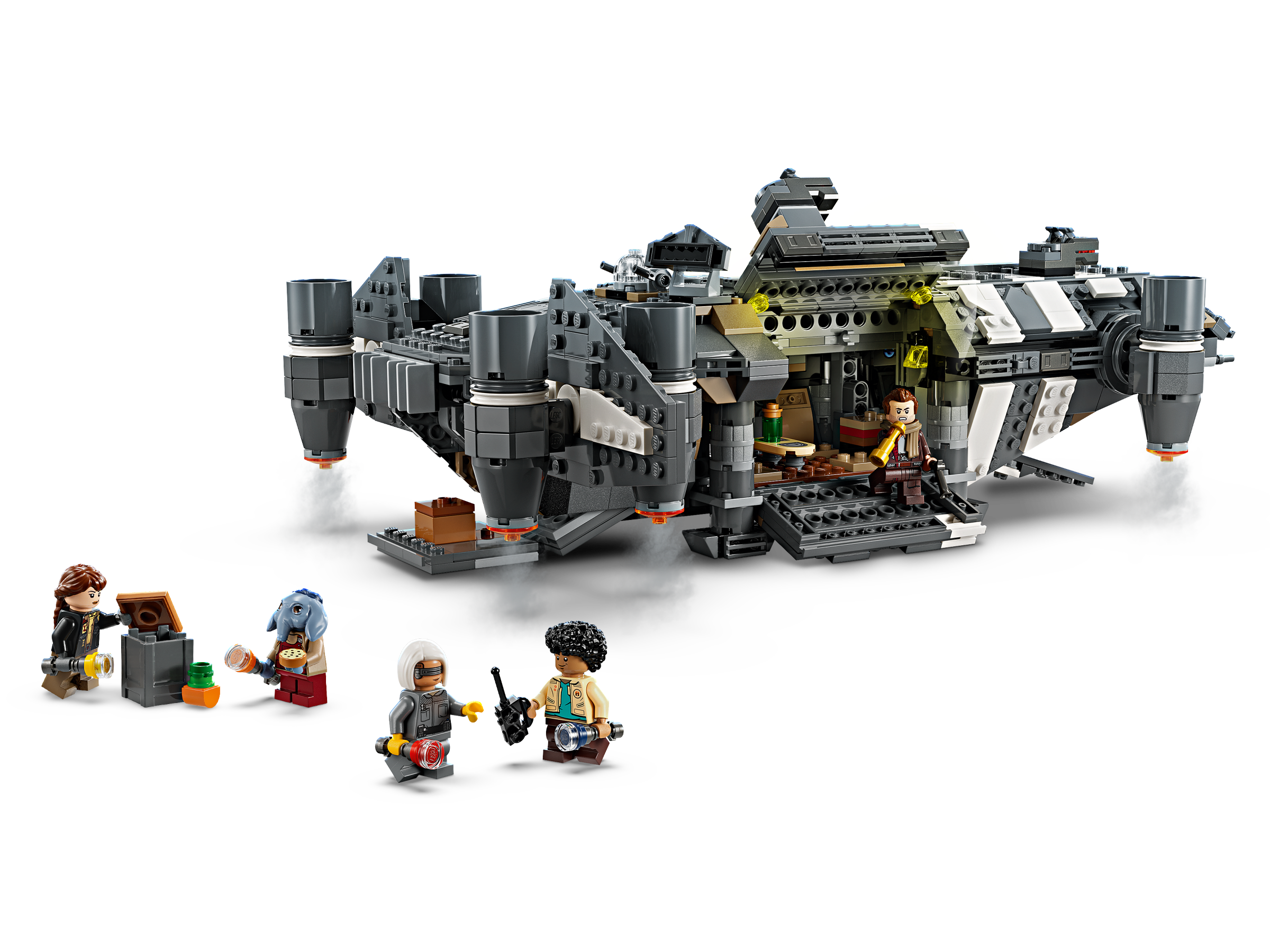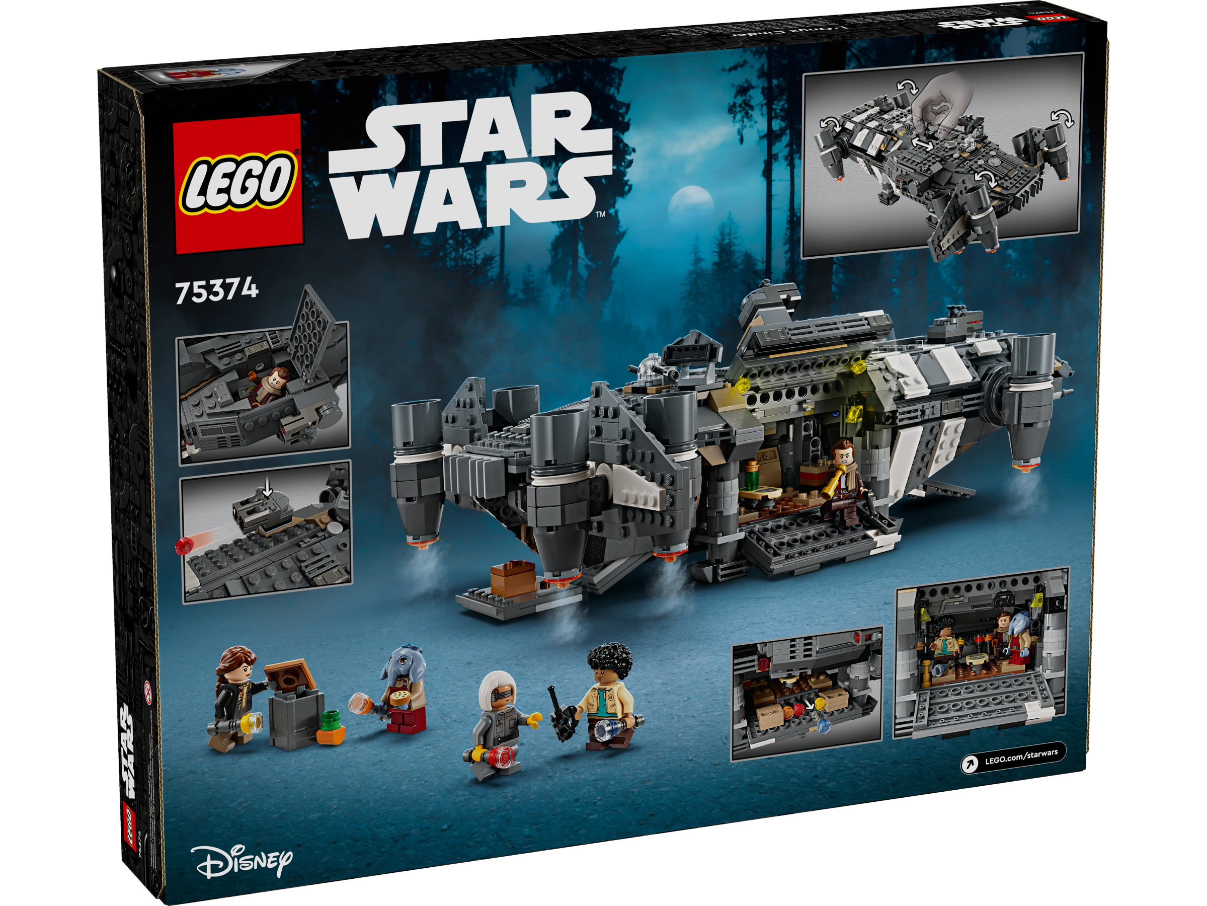 Kids become the heroes in their own Star Wars: Skeleton Crew stories with a detailed LEGO® brick recreation of The Onyx Cinder (75374). This collectible LEGO Star Wars™ buildable starship toy features rotating engines for landing/takeoff or flight, 2 stud shooters, 2 rotating turrets, each with 2 stud shooters, and a grabbing claw. It has seats for all 5 included LEGO Star Wars characters (the Jod LEGO minifigure in the cockpit and Wim, Fern, KB and Neel in the passenger compartment), plus storage for the 4 buildable torches and other cargo. There is also a kitchen table and a bed, plus accessory elements including fruit and a walkie-talkie to inspire creative play.