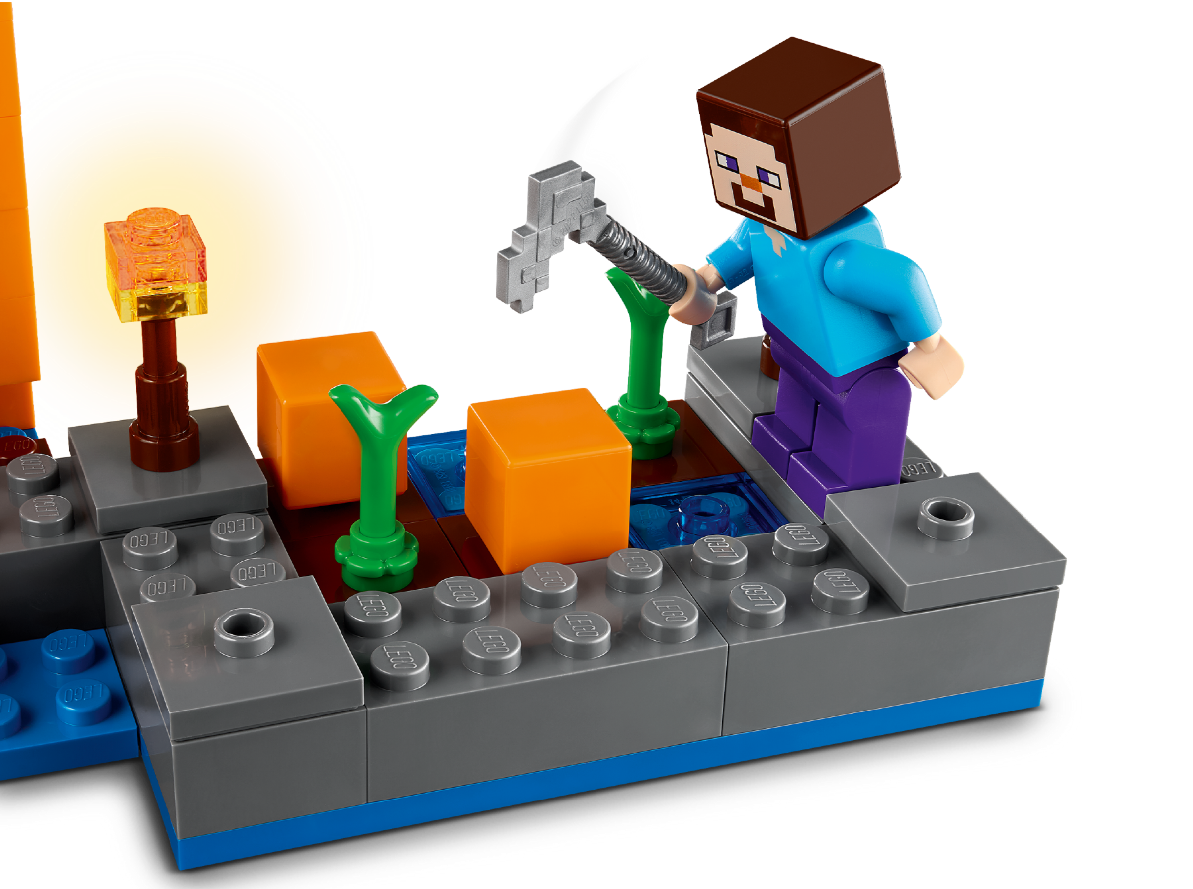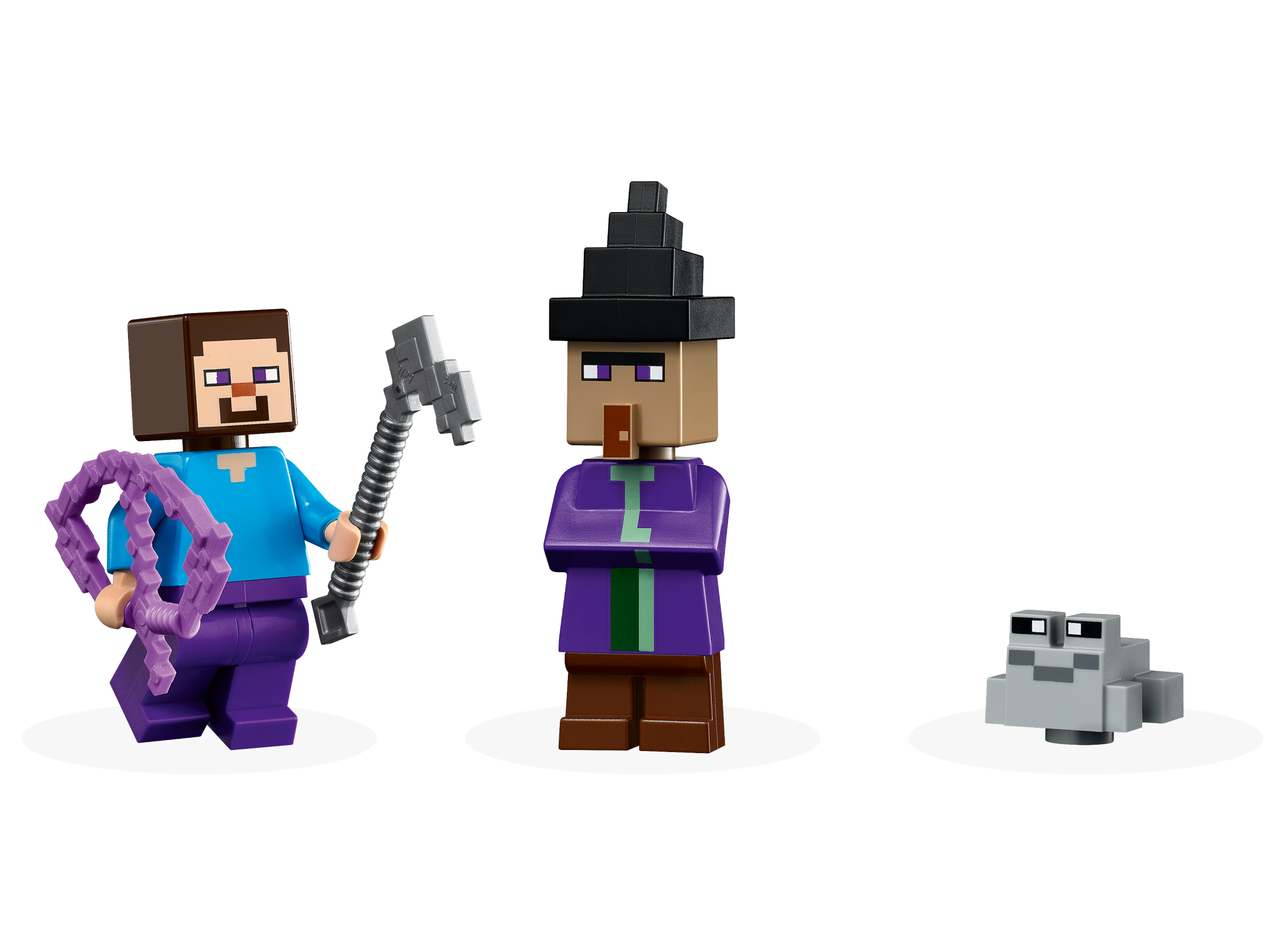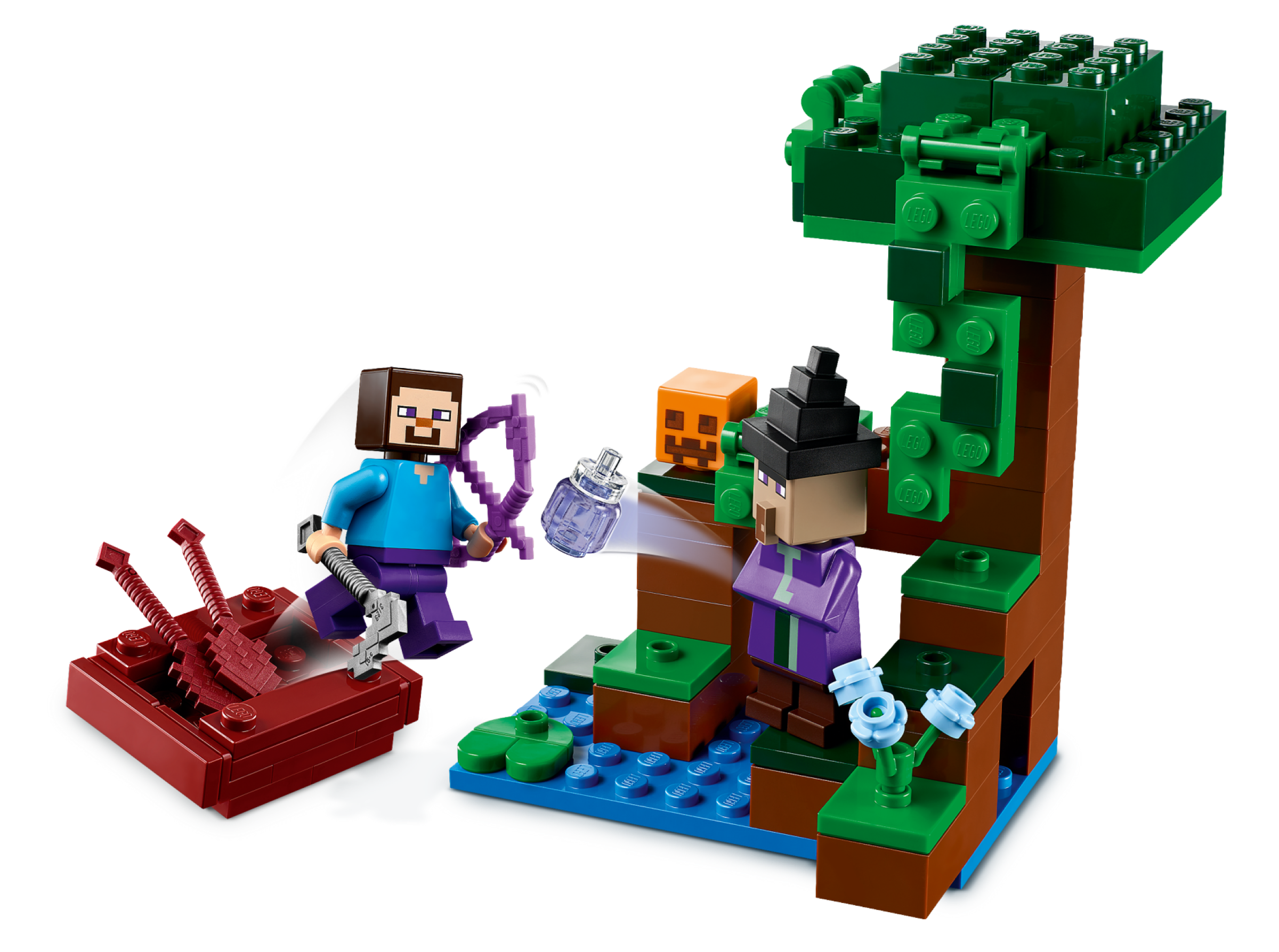Set in the game’s infamous swamp biome, this highly reconfigurable toy features leading character Steve at a pumpkin farm built around a pumpkin-shaped house. The house has a furnished interior, including a bed, crafting table, furnace and a frog light. Outside is a pumpkin patch that Steve cultivates with his hoe. Play opportunities shift to battle action when a witch throws potions at Steve and he fends her off using his bow. The set also includes a frog, boat and a chest containing an egg and sugar, giving kids the opportunity to make pumpkin pie! For added digital fun, builders can zoom in, rotate sets in 3D and track their progress using the fun LEGO Builder app.