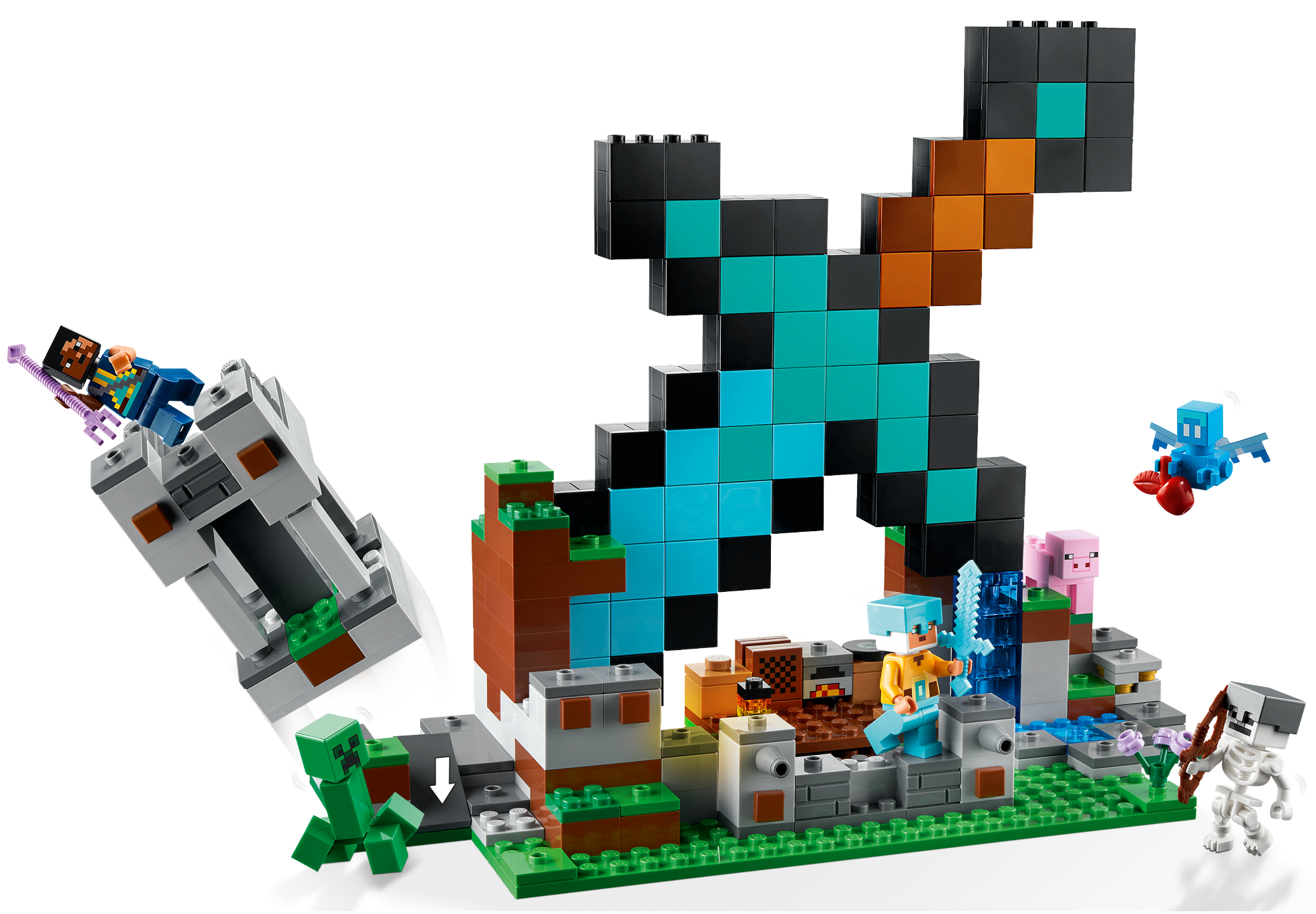 Kids build a giant diamond sword base into the side of a mountain and defend it against attacks by hostile mobs. The base includes a table, cookie and a jukebox on which they can ‘play’ a record. Outside, Sentinel Soldier and Guardian Warrior figures stand guard. Further firepower is provided by 2 shooters located at the front of the base. Hostile mobs include a Creeper™ and a skeleton. Friendly mobs include a pig and an allay, which features foil wings. A lever at the bottom of the tower triggers an explosion that collapses part of the structure. For added digital fun, the LEGO Builder app features intuitive zoom and rotate tools that let kids visualize their model as they build.
