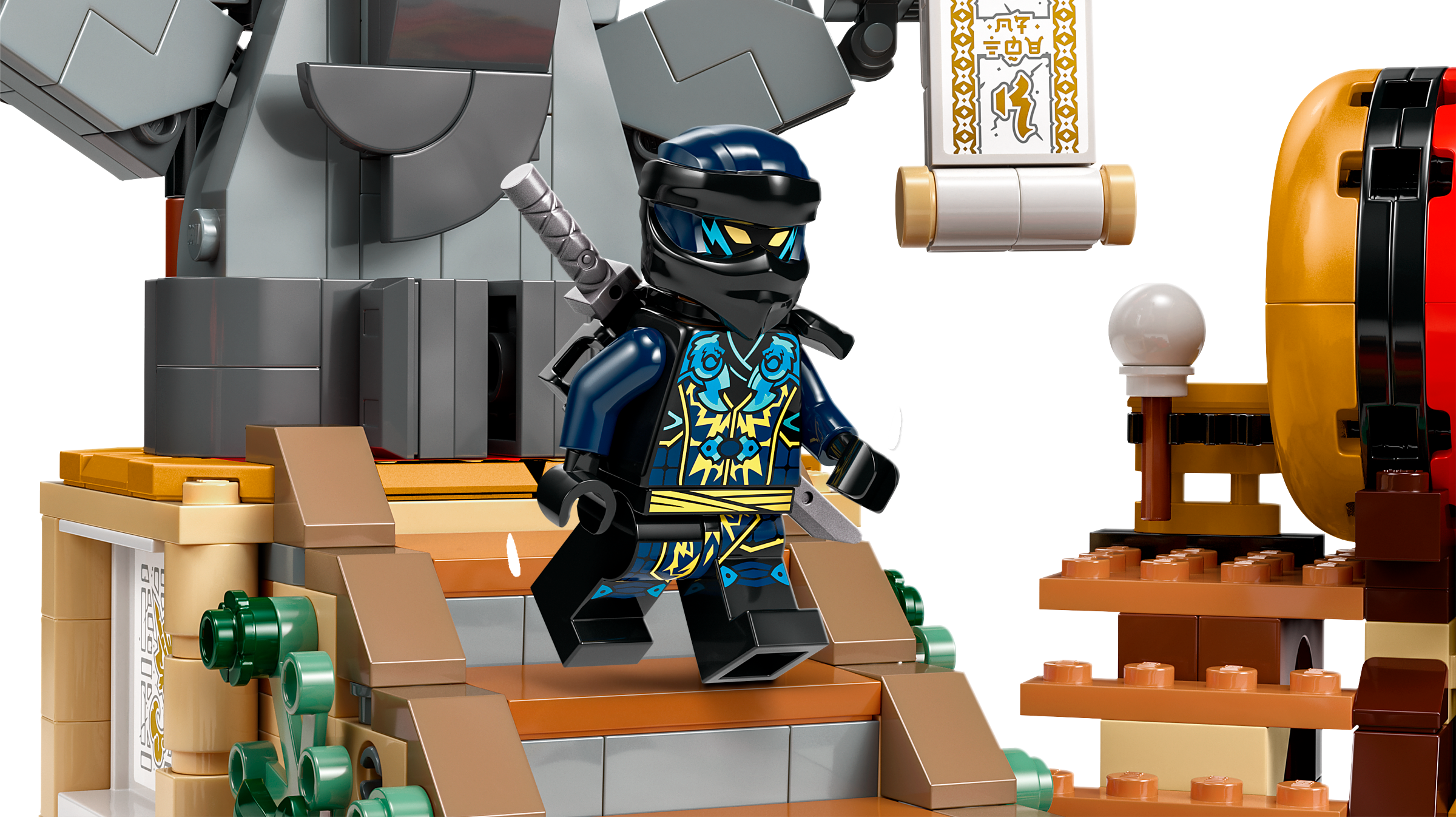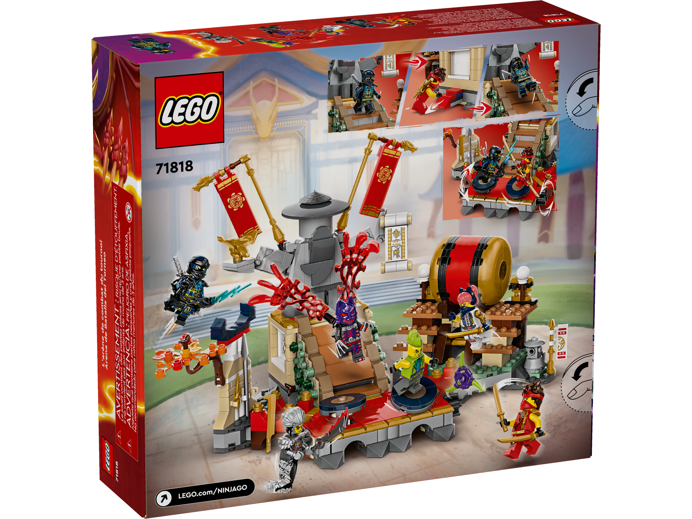 This LEGO® NINJAGO set includes 2 moving platforms so kids can play out exciting battles with a ninja and a villain, a large drum they can push off its stand to roll into the arena, and a staircase that collapses with the pull of a lever, causing any characters on it to slide to the bottom.
