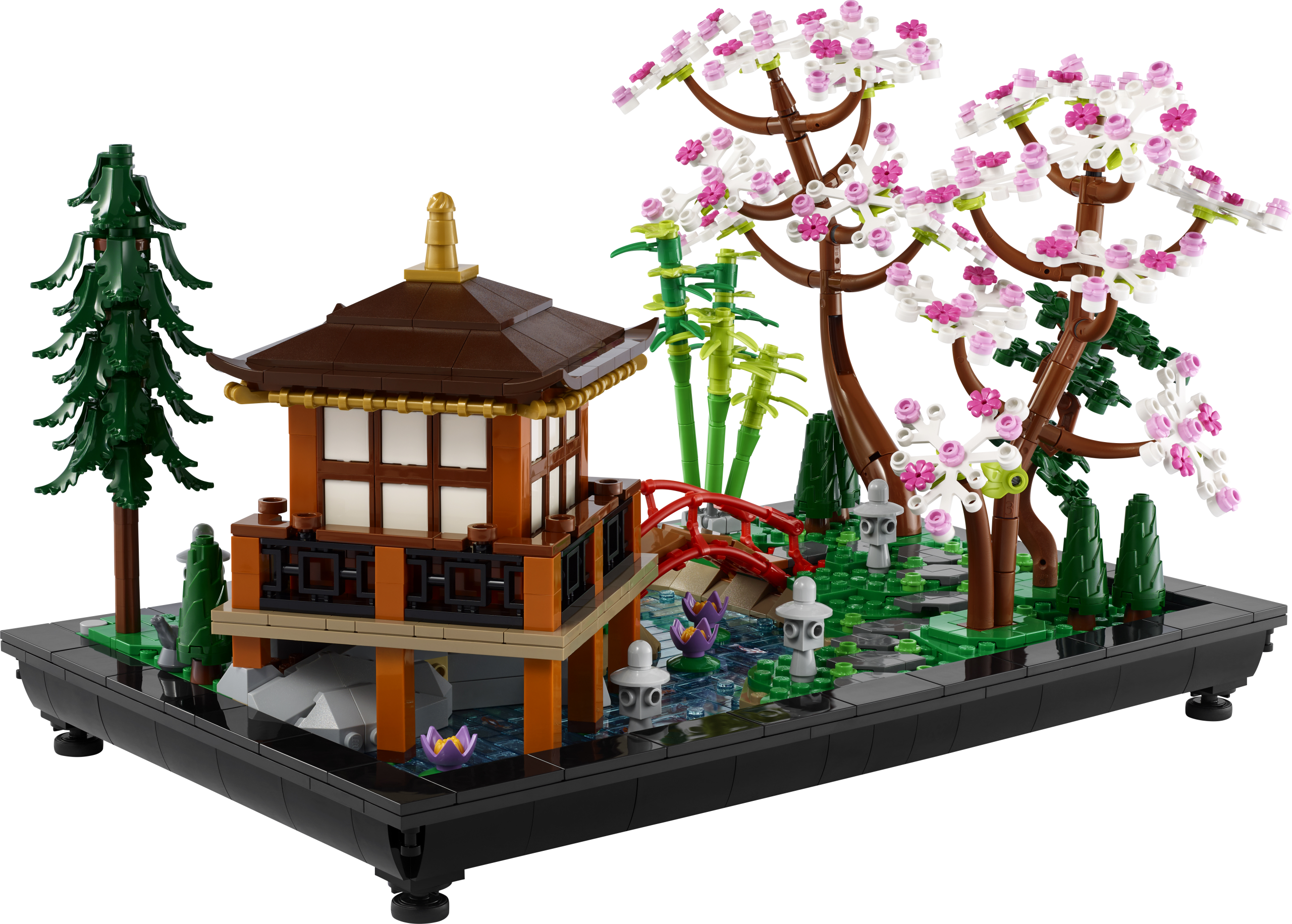 Based on a traditional Japanese garden, this buildable model includes an arched bridge, stream, koi carp, lotus flowers, trees, rocks, stone lanterns and a pavilion with a detailed tea-ceremony room.