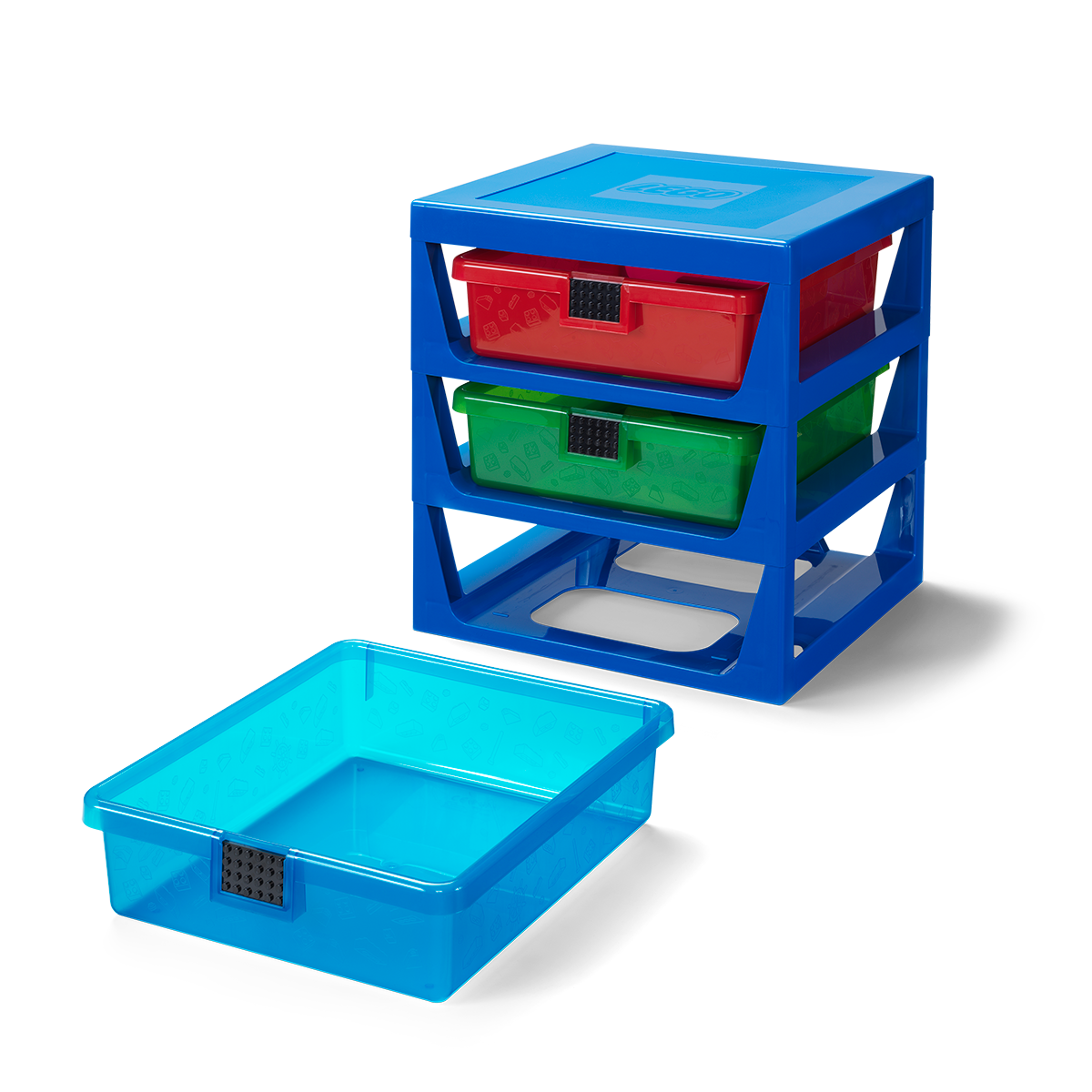 Give LEGO® builders somewhere to get creative as well as organize their LEGO bricks and pieces with this Transparent Blue LEGO Iconic Rack System. The sides of the 3 colored, removable drawers are etched with decorative LEGO bricks. A baseplate at the front of each drawer lets kids customize it with their own LEGO creation. The top surface features an integrated baseplate, giving kids a great building experience and great storage in a single, child-friendly unit.