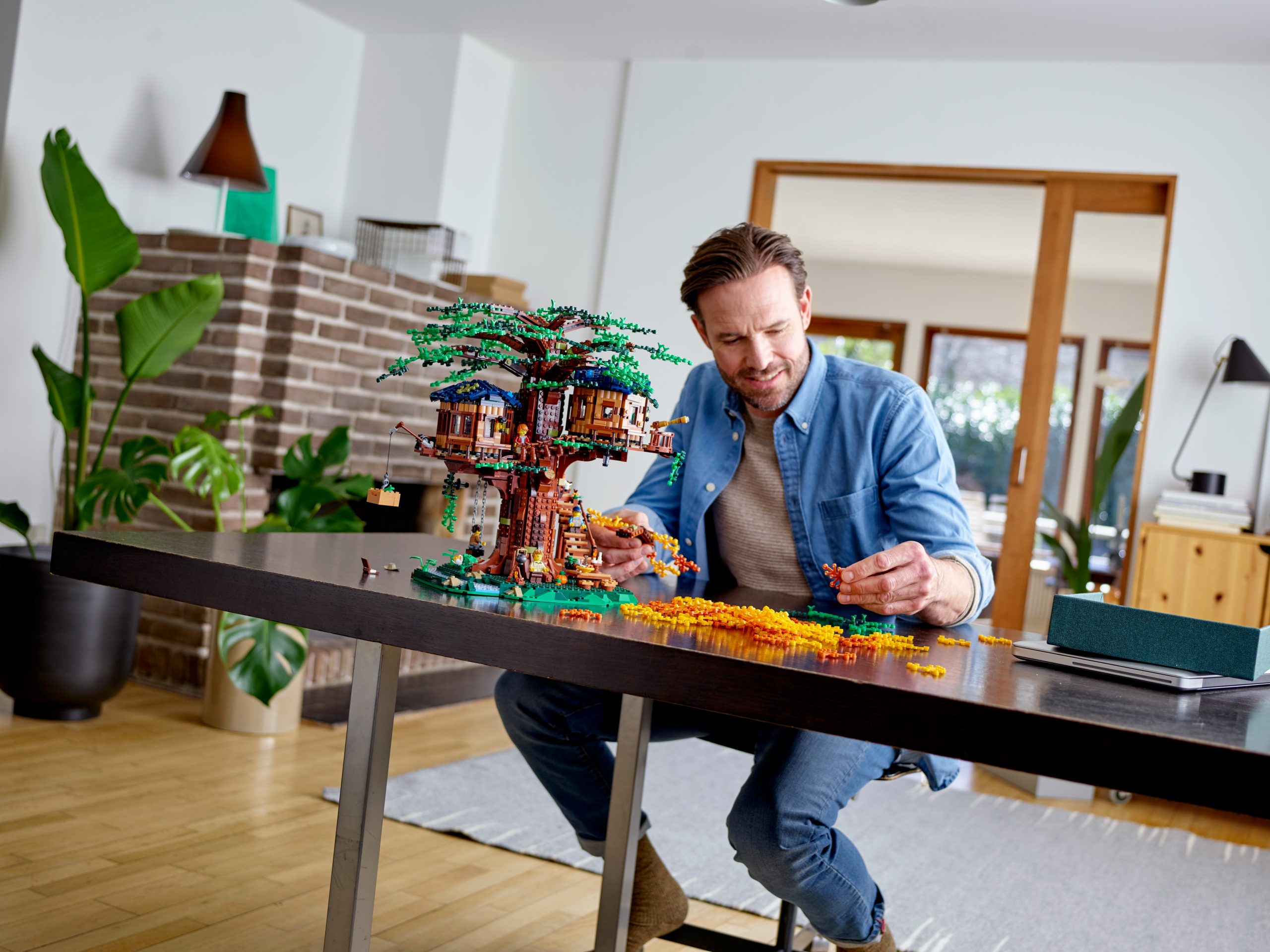 Build, display and play with this intricately detailed, 3,036-piece LEGO® Ideas 21318 Tree House playset. A complex build for experienced LEGO builders that all the family will love to play with, it features a landscape base and 3 LEGO tree house cabins—a main bedroom, bathroom and kids’ room. The tree has interchangeable sets of green summer leaf elements and yellow and brown fall leaf elements—these and various plant elements on the base are all made from sustainable-plant-based polyethylene plastic—and the treetop and cabin roofs are removable to allow easy access. The model is packed with play-inspiring features including a buildable picnic table and seats, swing, bonfire, treasure map and hidden gem element to play out a treasure hunt, and a wind-up crane on the balcony of the bedroom cabin. A great birthday gift, this unique creative toy comes with mom, dad and kids minifigures, plus a bird figure, to role-play fun family scenes. It also includes a booklet with building instructions and information about this LEGO Ideas set’s fan creator and LEGO designer.