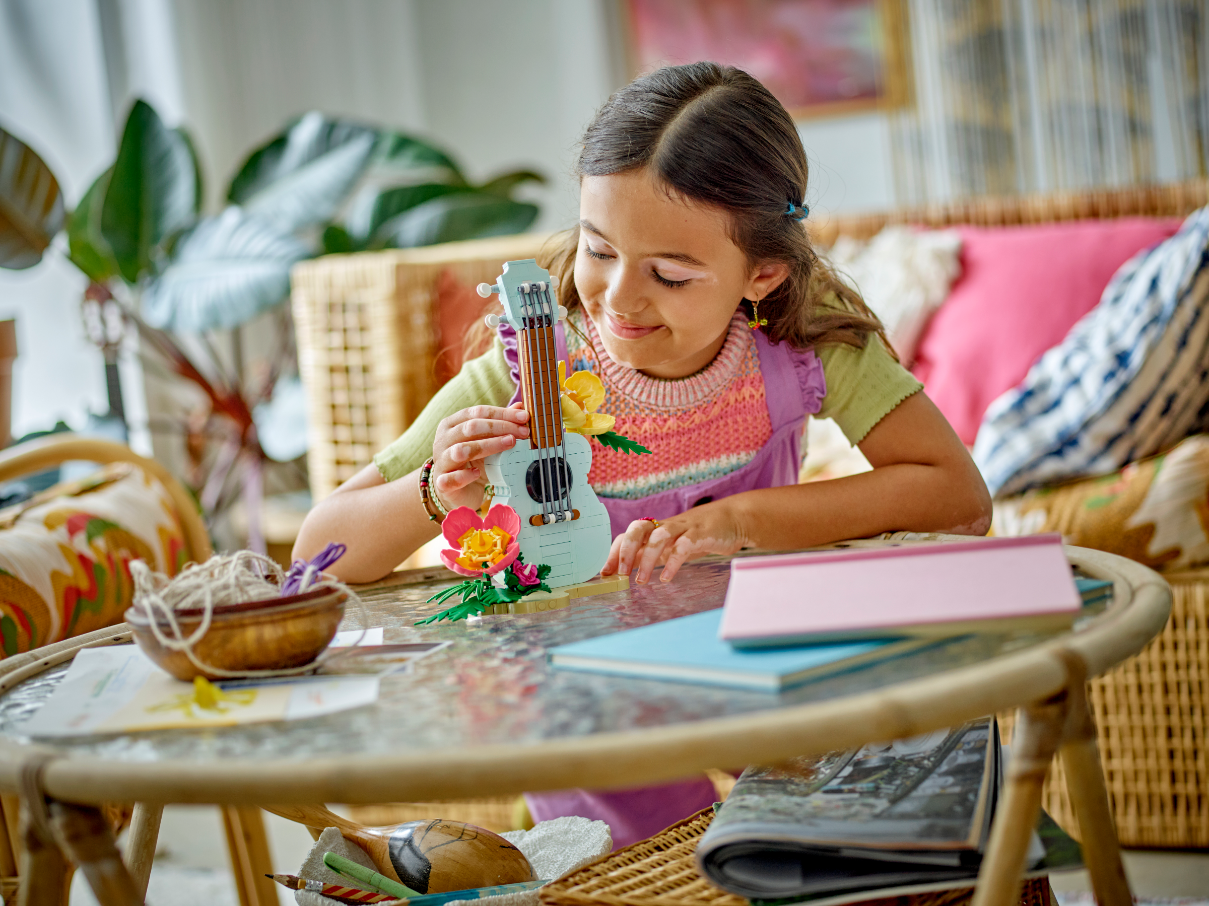 Kids can build, play with and display 3 beach-themed models in the LEGO® Creator Tropical Ukulele (31156) 3in1 playset. A great gift idea for girls and boys aged 8 , it features a ukulele on a beach scene stand with 2 colourful flowers and grass. The instrument toy can be detached from the stand and has 4 plastic strings that vibrate when strummed.