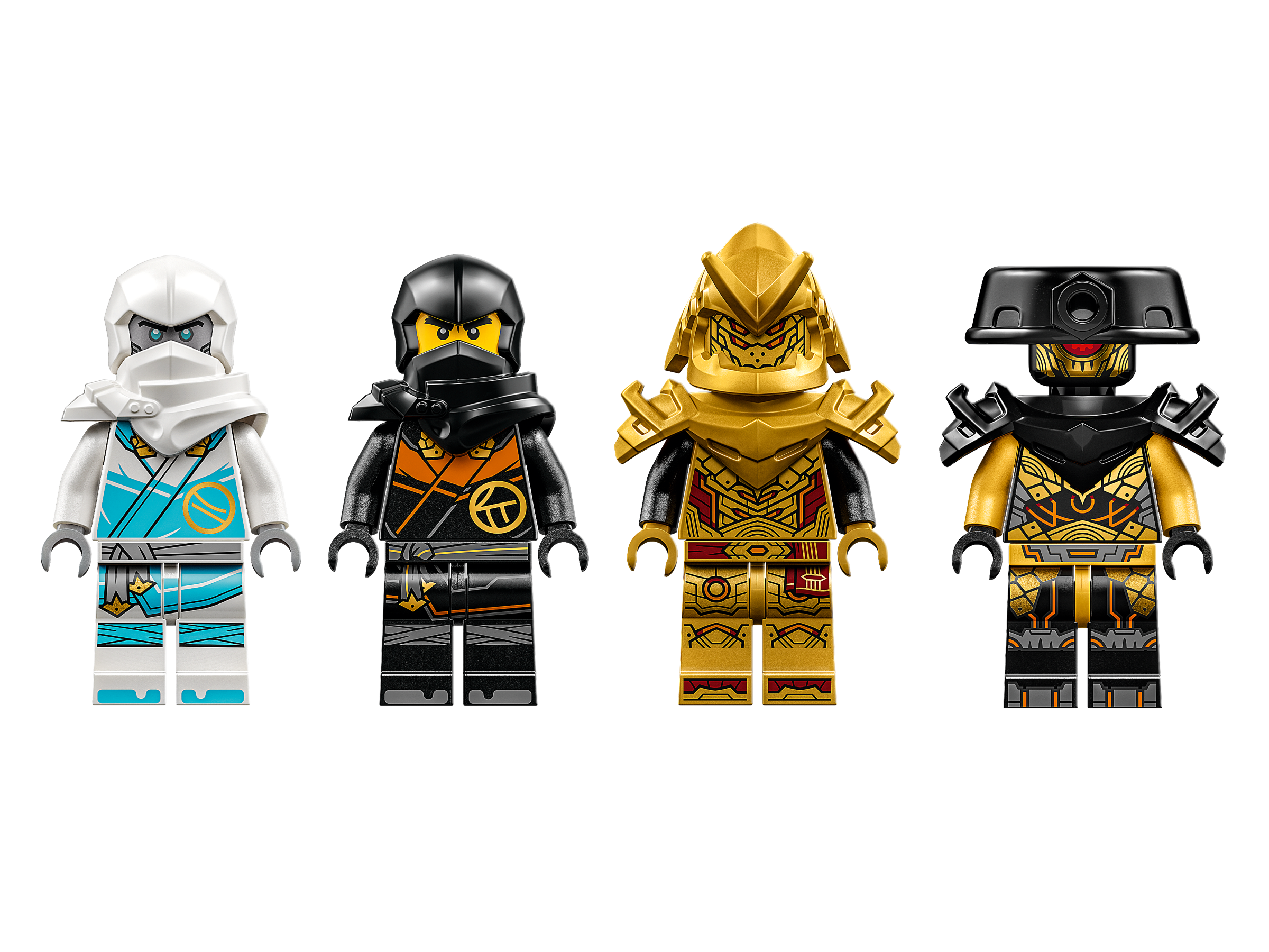 This ninja car playset comes with 4 Minifigures: ninja warriors Zane and Cole armed with 2 katanas each, an Imperium Guard Commander and Imperium Claw Hunter, and an Imperium Droid. The Imperium Guard Commander has an Imperium sword, the Imperium  Claw Hunter has an electric staff, and both travel on cool hover flyers. There are 2 blue dragon power elements and kids can collect 4 more in different colors in other NINJAGO sets.